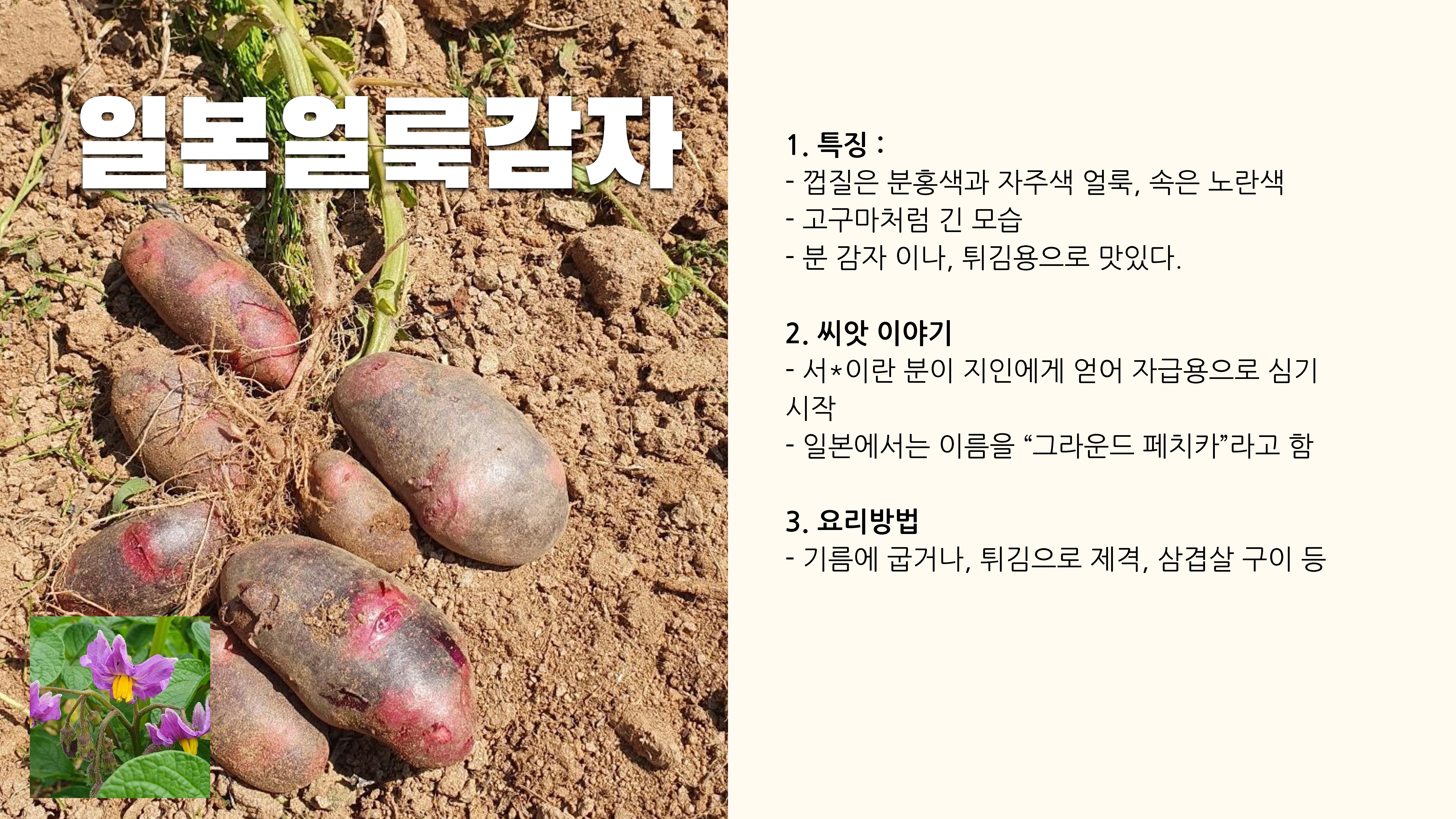 - 일본감자(2품종) : 일본홍감자, 일본얼룩감자