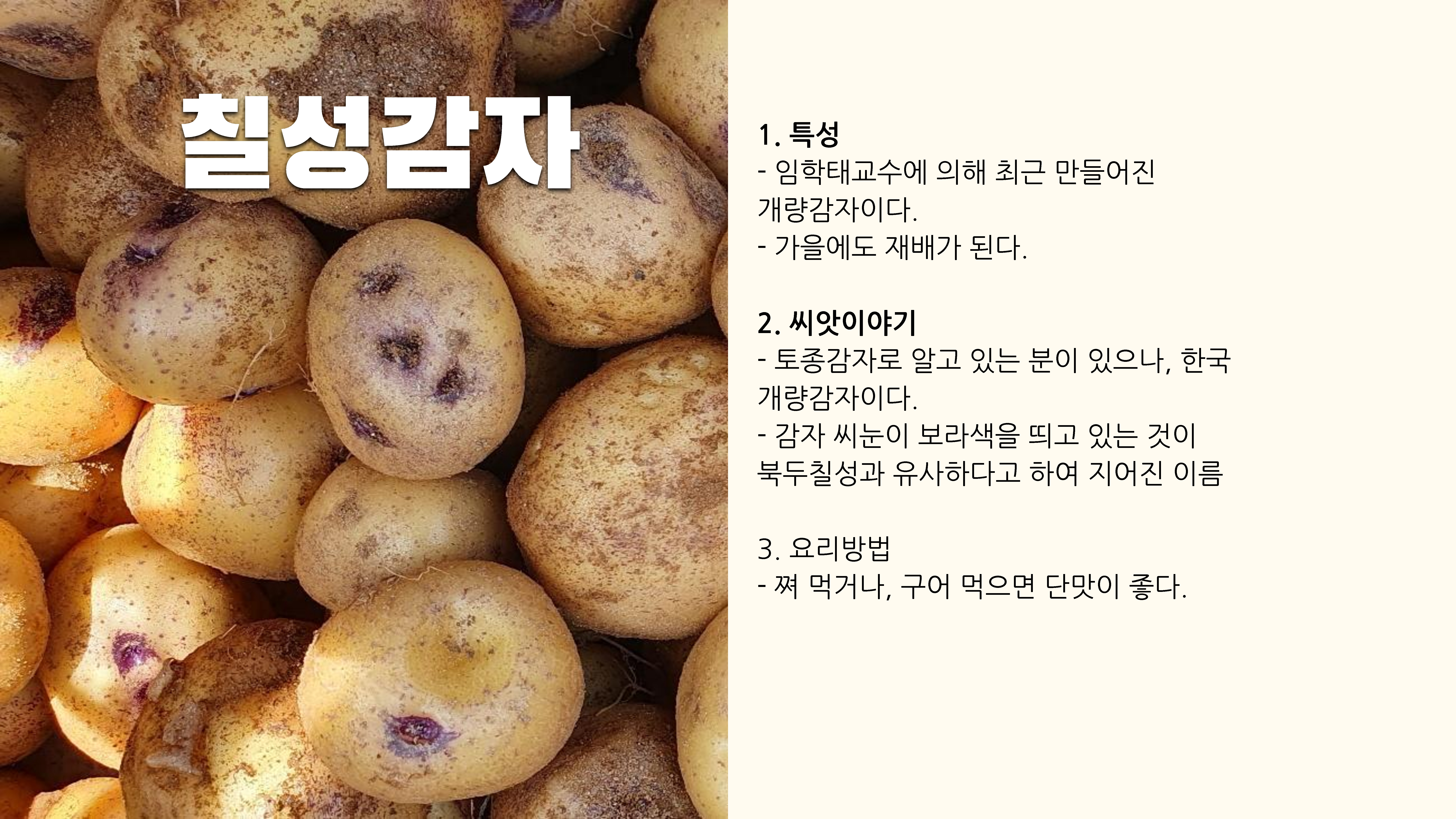 - 한국개량(3품종) : 칠성감자, 신남작감자, 두백감자
