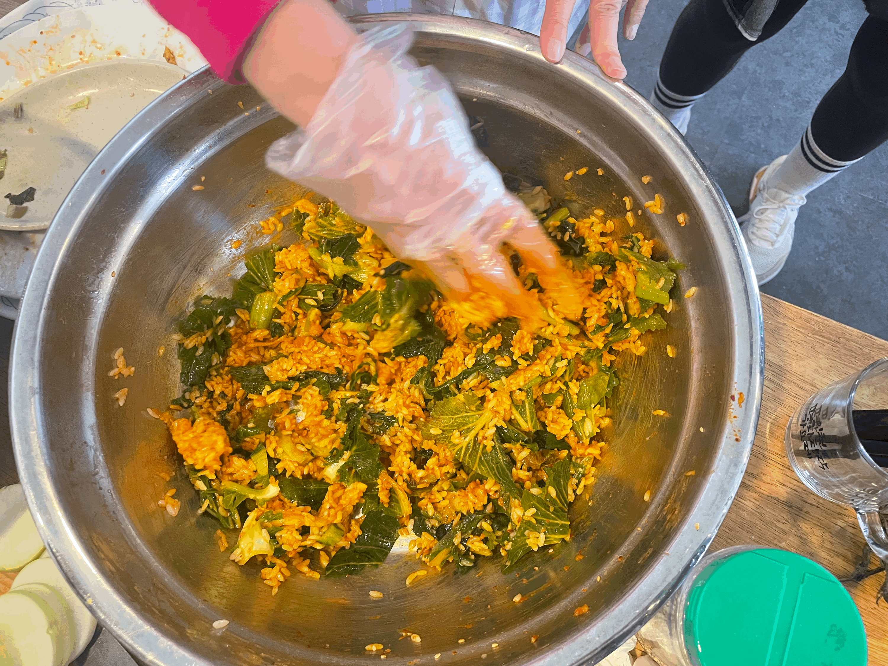 숟가락과 손이 삼삼오오 모여 슥삭슥삭 빠알간 색이 잘 나오도록 섞어줍니다.