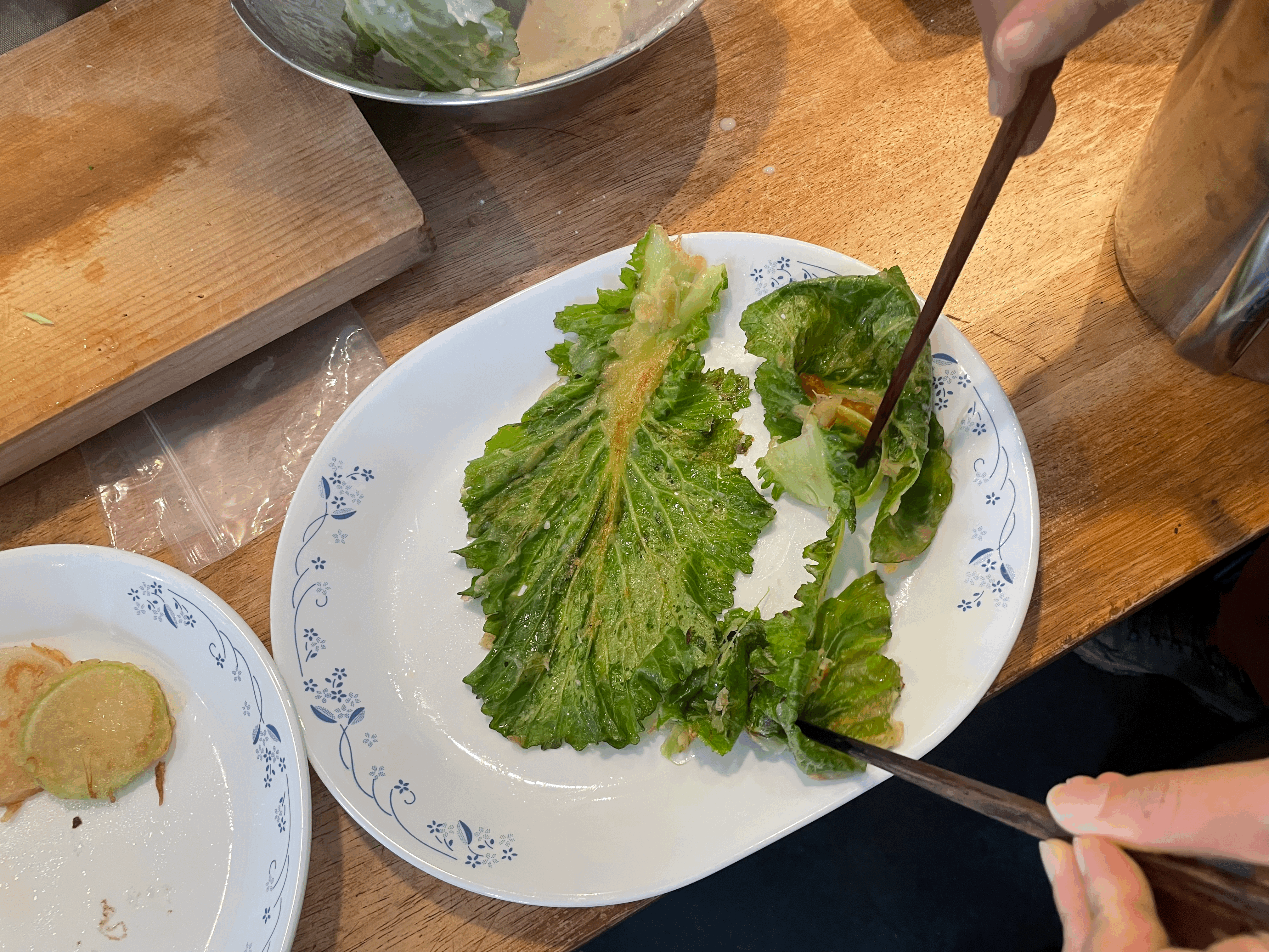 언제 와서 준비하셨는지, 겉절이로 쓰일 양념장이 뚝딱 만들어져있었고, 배추전과 무전을 부칠 준비를 하고 계셨습니다. 그 사이에 또 새로운 요리가 나왔는데요. 무를 데친물이 아까우시다며 그 물에 배추와 무청을 살짝 데칩니다. 간장, 액젓, 참기름을 넣고 조물조물 무친 틈새 요리는 짜지도 않고, 담백하고 아삭한 식감이 너무 좋았습니다.