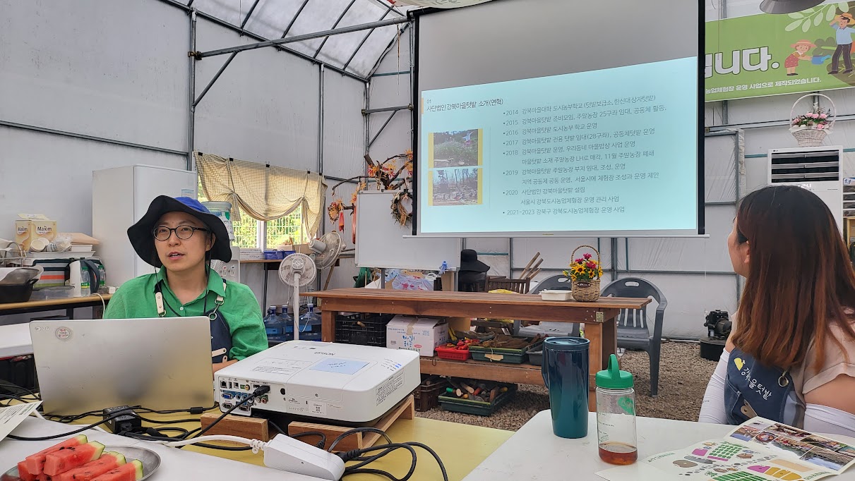 그렇게 공동체 방식으로 회원들과 텃밭을 운영하고 있었는데 LH가 민원을 받게 되면서 토지 임대를 하지 못하게 되었습니다. 이 텃밭을 지속하기 위해 또다시 방법을 찾아보니 서울시에서 도시농업을 위해 토지를 임대하는 것은 가능하다고 해서 시 예산으로 텃밭도 지속할 수 있었고, 교육장소로 쓰일 하우스도 짓고 텃밭도 확장하고 강북마을텃밭도 사단법인이 되었다고 합니다. 안타까운 지점은 서울시의 도시농업 정책이 힘을 잃어갔던(도시농업 담당 부서, 도시텃밭이 없어지는 등…) 때가 강북마을텃밭은 참여자도 늘고 규모가 커지는 시기였다는 것입니다. 그래서 장애인단체, 돌봄단체, 이주여성 등 더 다양한 주체들이 참여하고 열린 텃밭이 될 수 있도록 노력하고 있다는 이야기를 하셨습니다. 거기에 활동을 하다보니 기후위기, 먹거리, 퍼머컬쳐 등 다양한 주제에 대한 인식이 생기고 공부를 해나가고 있다고 합니다.