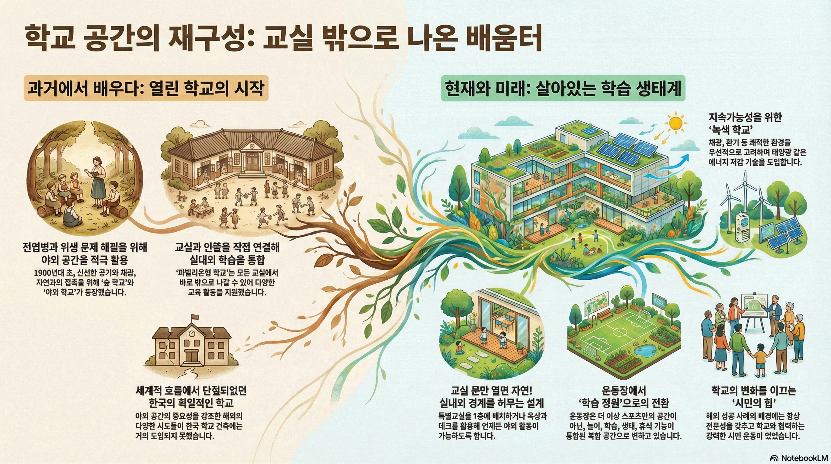 공부를 하는데 도움이 될 2차 생성자료들은 모두 노트북LM을 활용해 생성한 것입니다. 짧은시간에 개념을 이해하기에 잘 설명된 것으로 유용합니다. 더불어 김성원 소장님의 원본강의영상과 슬라이드자료를 통해 더 폭넓게 공부를 해보시기 바랍니다. 시간이되면 소개해주신 출처들에 자료들을 공부하고 연구하면 학교공간에 대한 이해가 높아질 것 같습니다. 더불어 우리가 학교텃밭으로 하려고 했던 생태전환교육을 위한 공간구상에도 큰 도움이 될 것 같습니다.