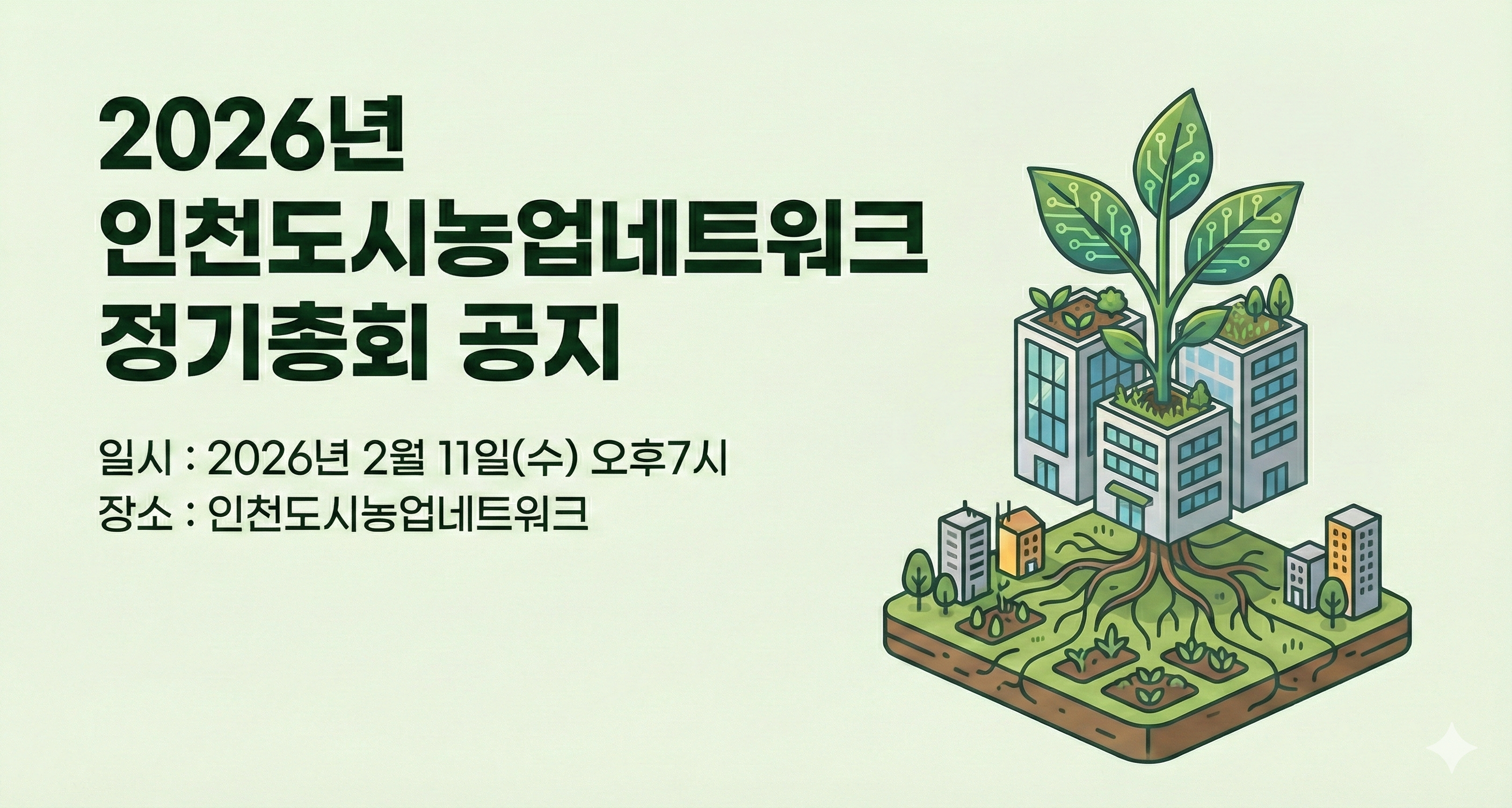 사단법인 인천도시농업네트워크 회원 여러분의 건승을 기원합니다. 정관 제17조에 의거하여 2026년도 정기총회를 아래와 같이 개최하오니, 바쁘시더라도 부디 참석하시어 자리를 빛내 주시기 바랍니다.
