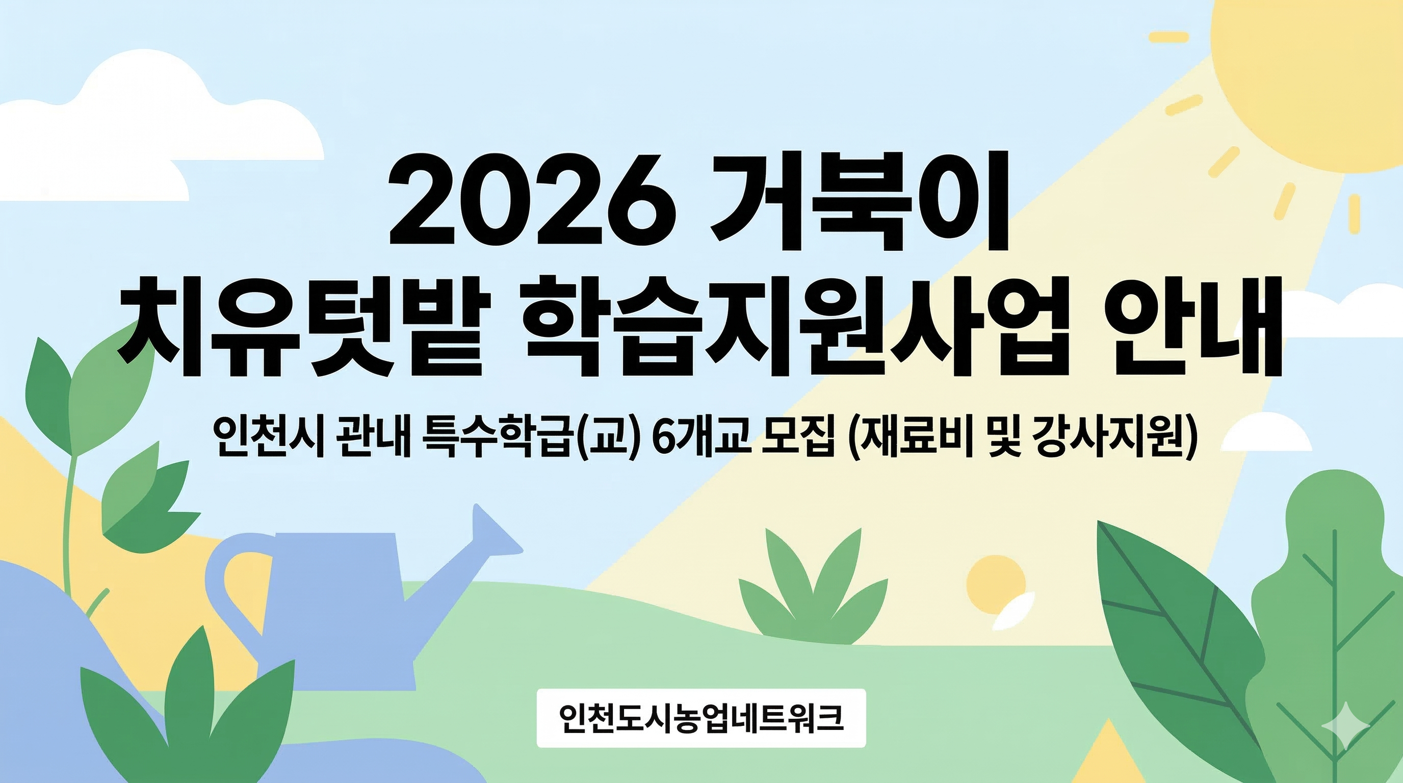(사)인천도시농업네트워크는 인천광역시 내 특수학급을 운영하는 학교를 대상으로 ‘2026년 거북이 치유텃밭 학습지원 사업’ 참여 기관을 모집한다고 밝혔습니다. 이번 사업은 복지형 도시농업을 실천하기 위해 기획되었으며, 전문가의 지도 아래 아이들의 성장을 돕는 맞춤형 치유 프로그램을 제공할 예정입니다.
