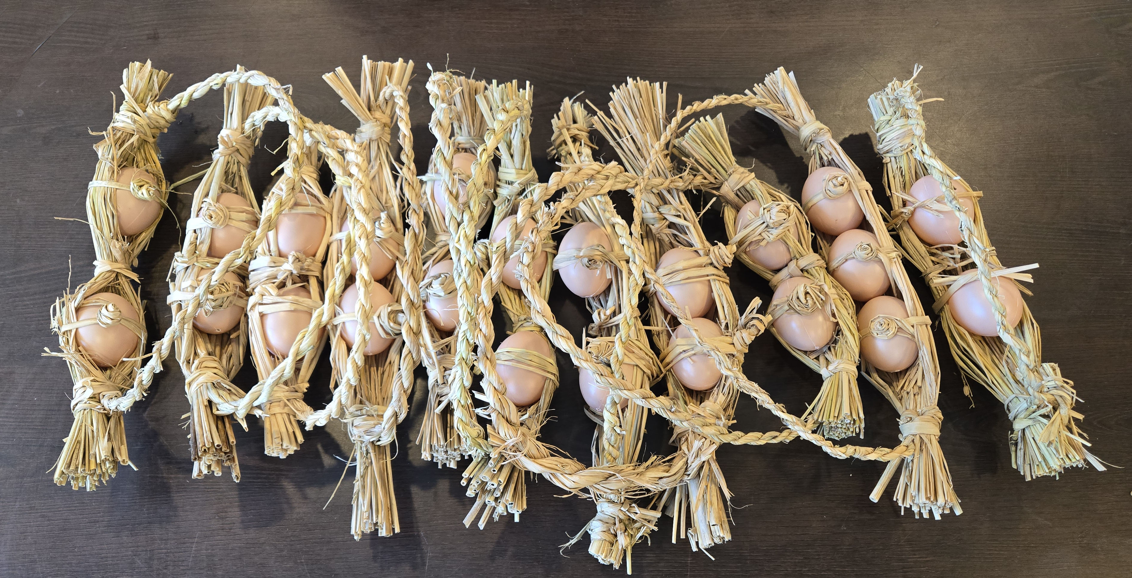 갓도정한 쌀밥이 지어지는 동안 계란꾸러미를 만들어 보기로 했다. 첫 단계는 새끼꼬기. 새끼꼬기가 이렇게 어려운 거였어? 새끼가 잘 꼬아져야 다음단계료 나가는데.. 하하. 하루 전 물을 뿌려 놓은 볏짚이 축축하지만 실내라서 바로 건조되어 물뿌리개로 물을 뿌려가며 새끼를 꼬았다. 매듭짓는 법도 배우고 마무리로 장미모양 매듭으로 계란을 고정해준다.