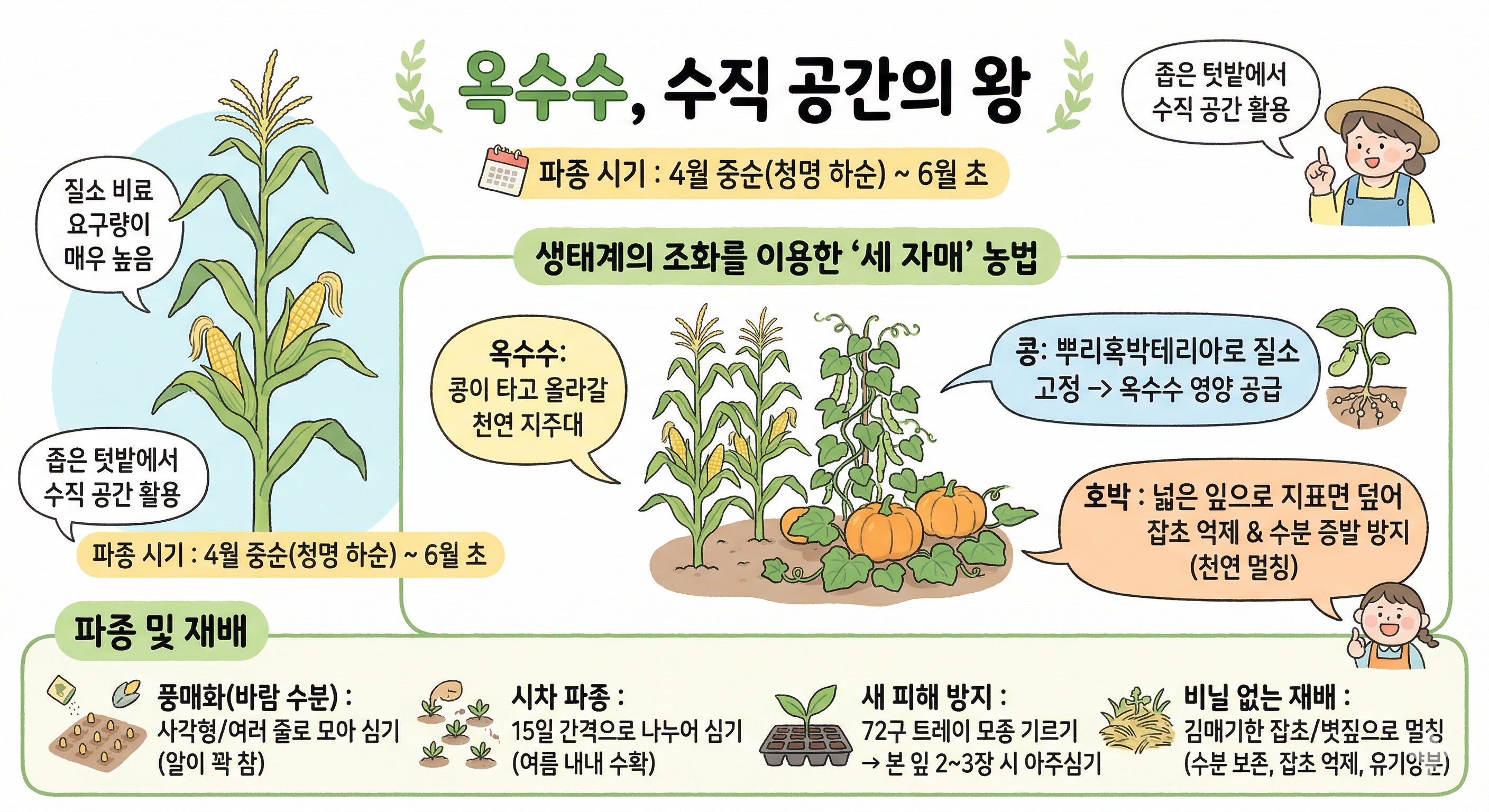 - 콩: 뿌리혹박테리아를 통해 공기 중의 질소를 땅속으로 고정하여, 질소 탐식자인 옥수수에게 필수 영양분을 공급합니다.