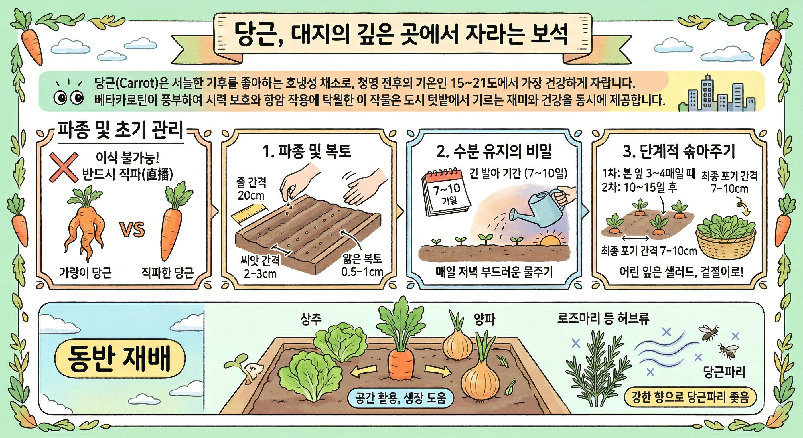 당근(Carrot)은 서늘한 기후를 좋아하는 호냉성 채소로, 청명 전후의 기온인 15-21도에서 가장 건강하게 자랍니다. 베타카로틴이 풍부하여 시력 보호와 항암 작용에 탁월한 이 작물은 도시 텃밭에서 기르는 재미와 건강을 동시에 제공합니다.