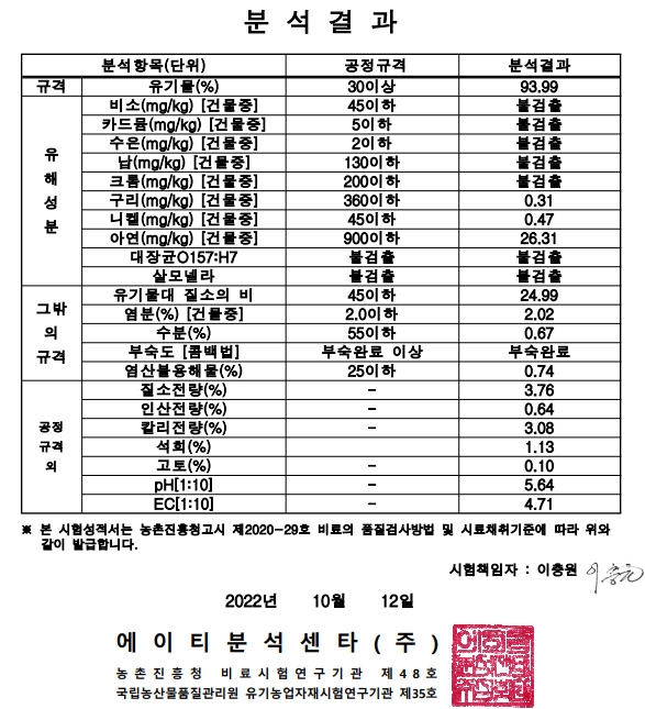 플라즈마자원화기를 통해 배출된 탄화부산물은 분석결과 유해성분이 모두 퇴비적합기준보다 낮게 나왔습니다. 다만 염분의 경우 기준치 2%와 비슷한 수치를 갖고 있습니다. 그래서 다른 퇴비처럼 과하게 쓰지만 않는다면 퇴비의 일부를 대체하게 되며, 토양개량효과와 유기비료의 역할도 할 수 있습니다. 바이오차보다는 질소함량이 높지만 유기비료에 비해서는 탄화된 형태여서 부숙기간이 더 오래걸려 더 안정화된 형태라고 볼 수 있죠.
