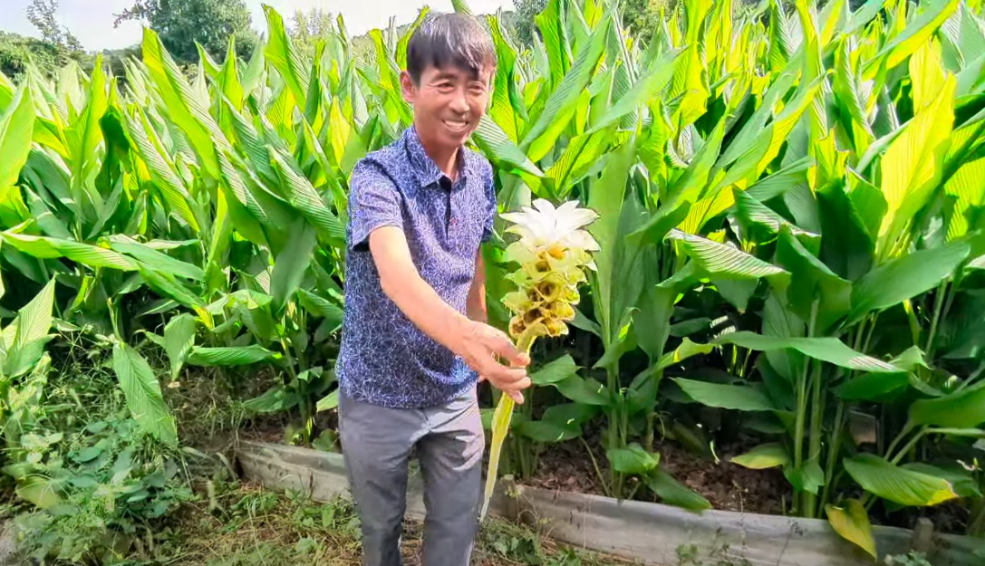 김한수 대표님이 울금 꽃을 하나 따서 주신다. 자유농장에서는 울금을 매년 심어 환이나 가루로 가공하여 판매도 한다.