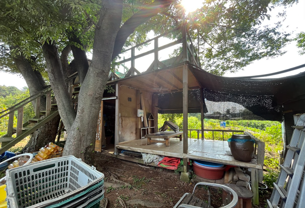 키가 20m는 훨씬 넘어보이는 거대한 느티나무 두 그루가 자유농장을 든든하게 지키고 있고 그 아래에 생태뒷간과 창고, 평상을 겸한 공간이 있다.