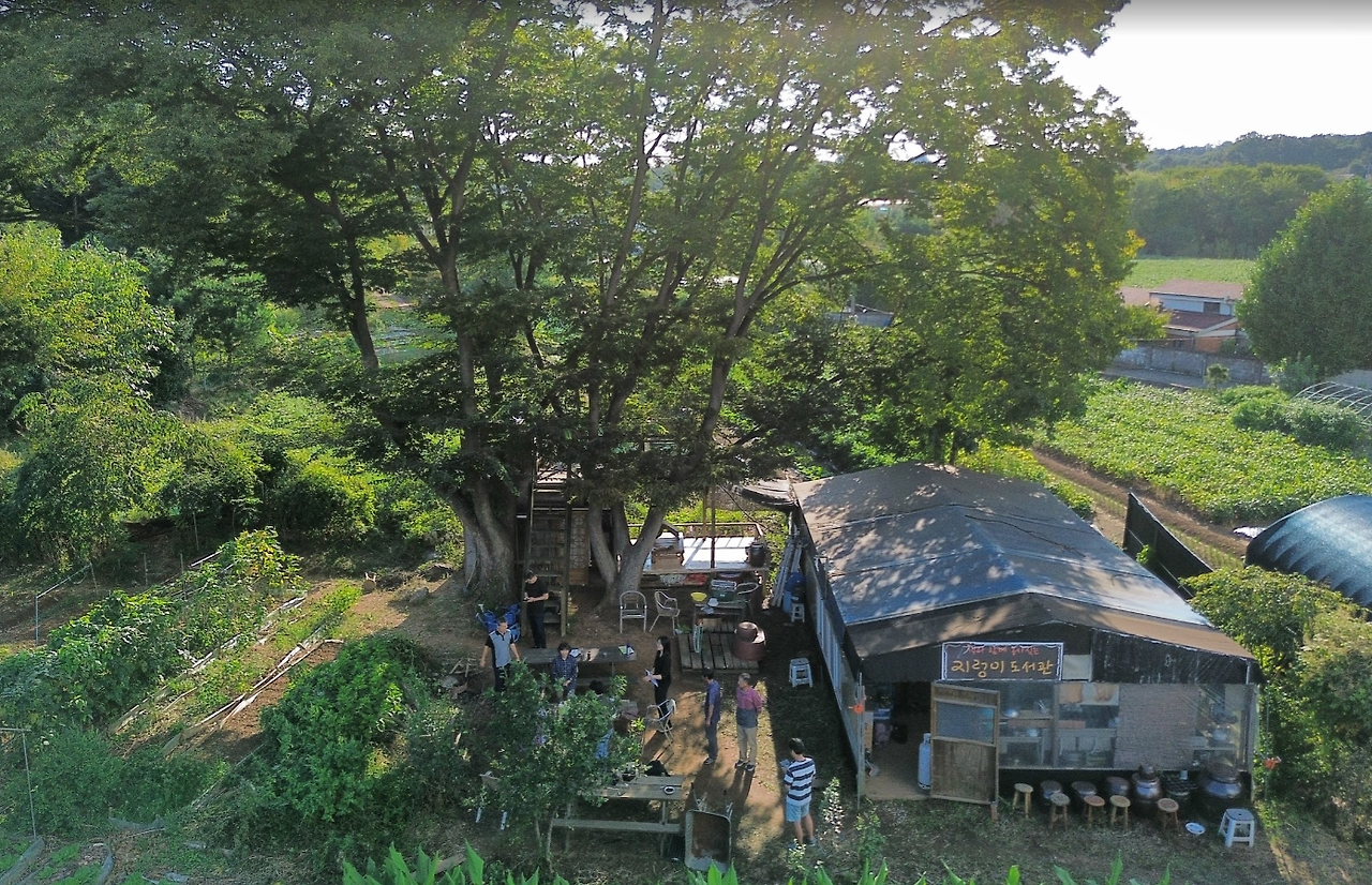 거대한 느티나무가 그늘을 드리운다. 오른쪽 아래 '지렁이 도서관'도 직접 만들었다.