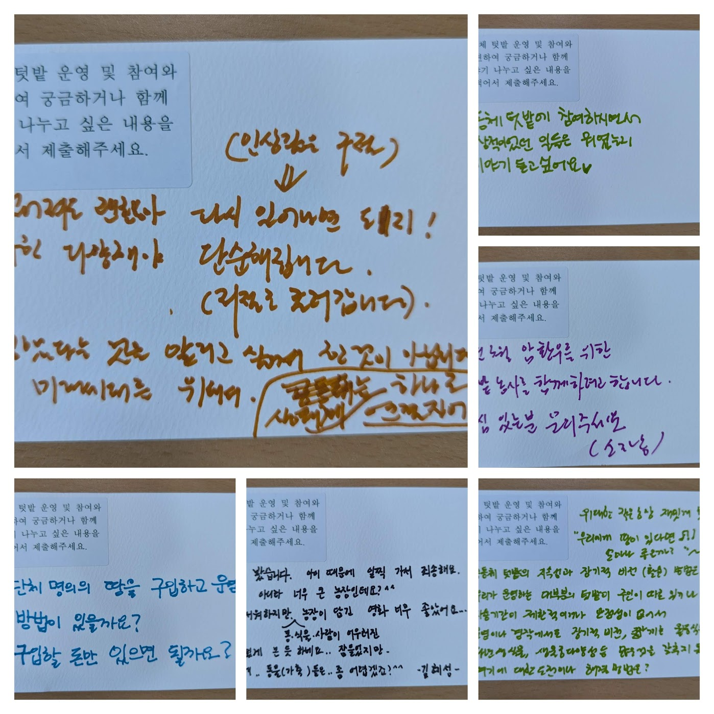 도시농업지원센터의 역할중 하나인 도시텃밭지원사업을 10년간 해오다가 최근 몇년간은 공동체텃밭에 집중하고 있습니다. 한번 지원하고 그치는게 아니라 지속적으로 관계를 맺으면 꾸준히 실천할 수 있게 노력하는 것이 중요하다고 생각했죠. 그래서 개인에 대한 지원보다, 꾸준히 텃밭이 운영될 수 있는 공동체를 지원하면서 공동체텃밭을 새롭게 조성하거나 이미 운영되는 공동체텃밭을 돕는 활동을 이어갔고, 작년에는 서로 교류하는 것이 좋겠다고 생각해서 [공동체텃밭한마당]을 열였습니다. ( 2023 공동체텃밭한마당 )