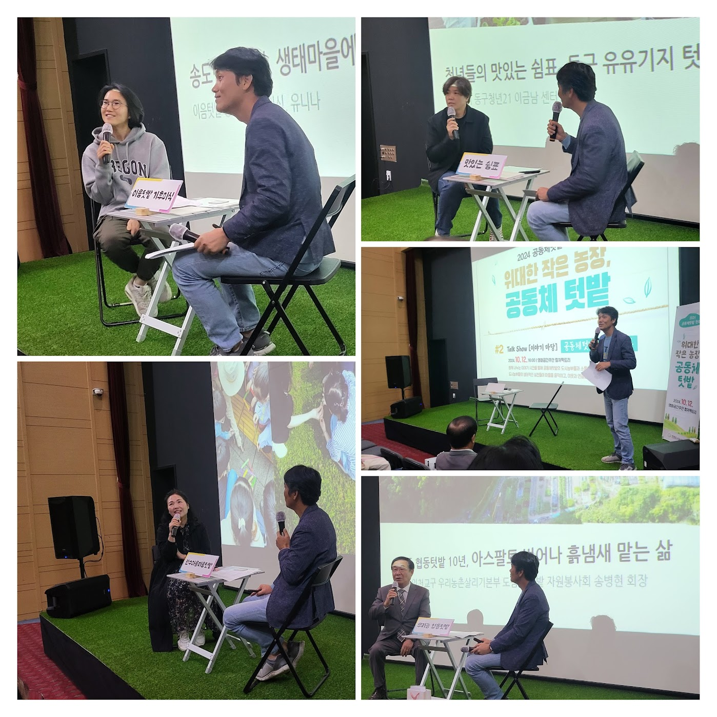 영화의 여운을 이어가는 2부 순서는 인천에서 일어나고 있는 공동체텃밭 이야기를 들어보는 토크쇼였습니다. 작은 옥상텃밭부터 만사천평 넓은 임야를 끼고 있는 농장까지 인천 곳곳에서도 위대한 작은 텃밭, 공동체텃밭들이 시도되고 있습니다. 네 분의 이야기손님을 중심으로 공동체텃밭에 대해 나누는 한 시간 삼십분이 지루하지 않게 진행되었습니다. 서로의 이야기 속에서 모두에게 도움이되는 시간이었습니다.