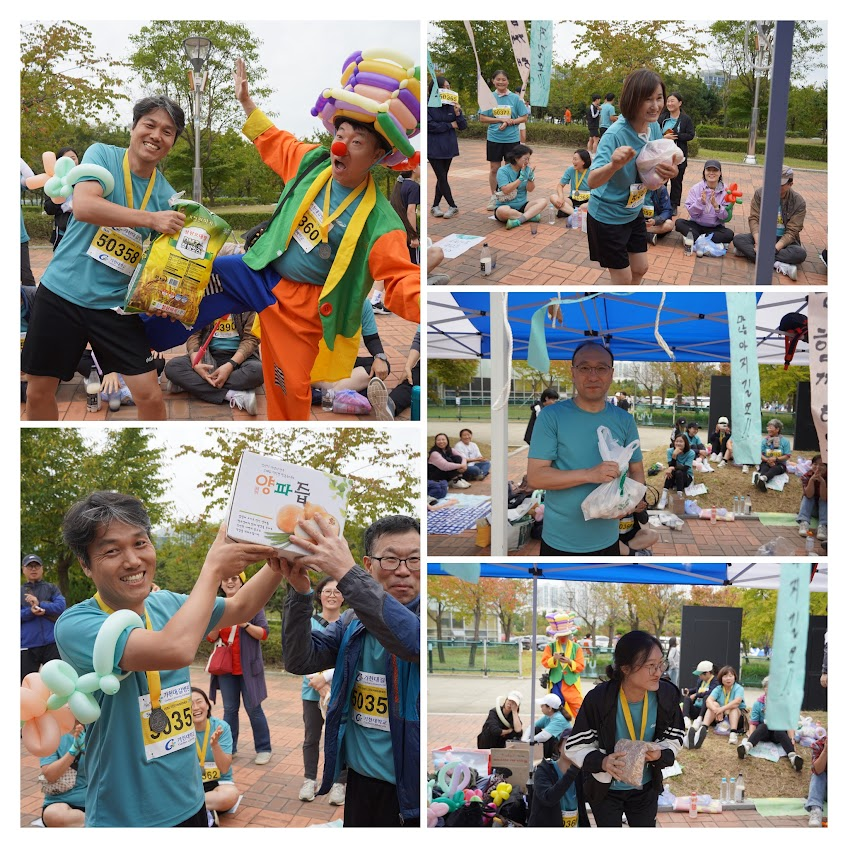 도시농부중 1등은 이날 삐에로하면서 풍선도 불며, 아이들에게 뛰다가 풍선을 불면서 왔는데도 여유롭게 첫번째로 들어온 김동수 회원, 2등은 의외로 마라톤체질을 가졌지만 오랫만에 뛰어서 실력을 보여준 박인재 회원, 3등은 마라톤 대회를 위해 무릎도 깨져가며 열심히 훈련한 송윤미회원, 4등은 김지영회원의 배우자이신 오영호님, 5등은 아메바의 배우자인 임계자님이 (사실 기록대로면 김동석 회원, 아메바도 중간 어디에 들어간다는.)