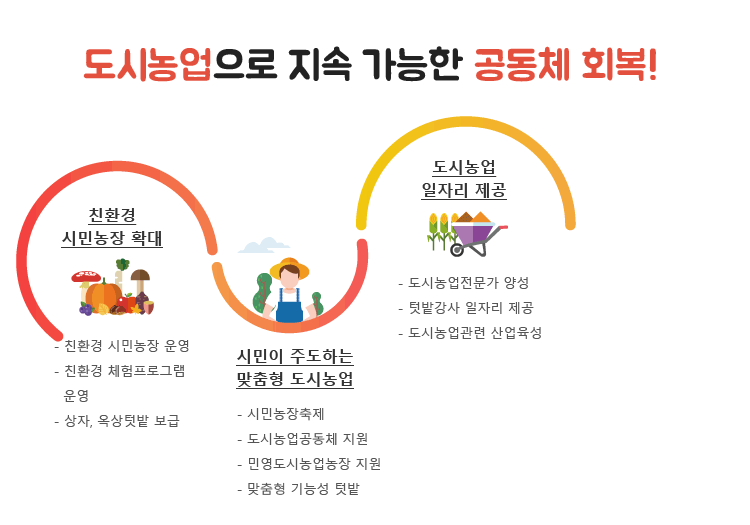 부천시는 도시농업의 목적을 공동체 회복에 대한 것으로 시작했다. 민간과 함께 시민 주도형 도시농업을 만들기 위해 다양한 노력을 하고 있지만 역시나 중간에서 도시농업활동가들과 함께 하는 것을 중요하게 보고 있다. 시민들과 접촉면을 높이기 위한 노력을 하고 있다.