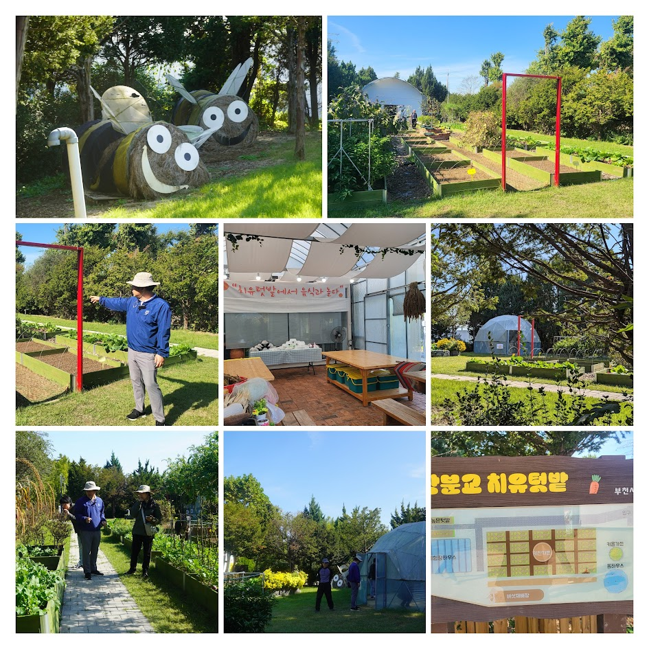 부천시 대장동이 몇 해 전 주택단지개발이 발표되면서, 부천시 유일하게 남아 있던 대규모 생산녹지가 사라지게되었다. 대장동 논들이 이미 아파트단지 공사에 들어갔다. 그래도 그중에서 일부 포함되지 않은 지역이 있는데, 대장분교(폐교) 자리가 길 하나를 경계로 보존되었다. 학교는 폐교가 되었지만 그 쓰임이 아직 없는데, 이 학교부지 중 일부(교문 밖 부지)를 활용해 치유텃밭으로 조성했다. 올해 치매안심센터와 연계해서 치유텃밭프로그램을 운영했다. 서비스대상 어르신들에게도 필요하지만 요양보호사들과도 협의하여 치유텃밭과 연계했다. 중점적으로 이곳을 미식텃밭으로 고민중이다. 한적한 공간에 가을분위기가 나는 텃밭의 야외테이블에서 담소를 나누니 시간이 언제가는지 모르게 편안함을 느끼게 된다.