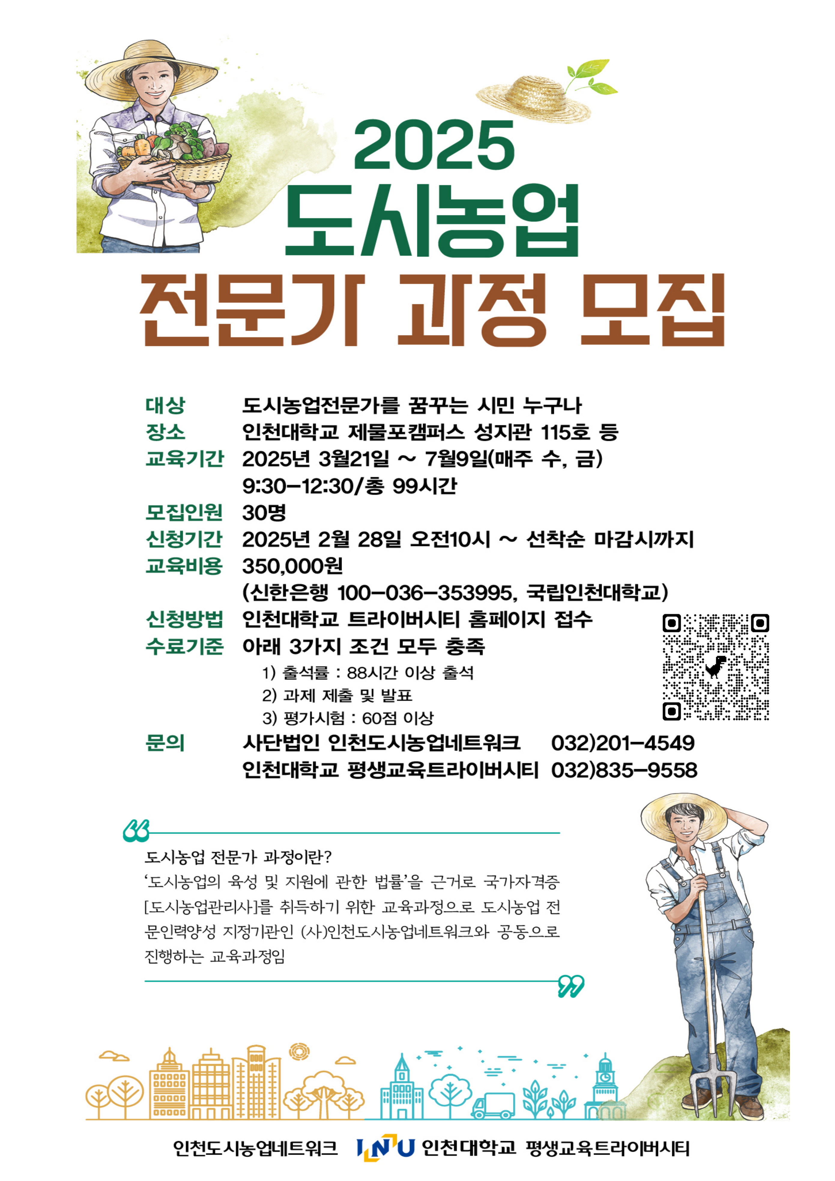 신청 : 선착순 마감시까지 / 인천대학교 트라이버시티 홈페이지 접수 https://bit.ly/도시농업전문가과정신청