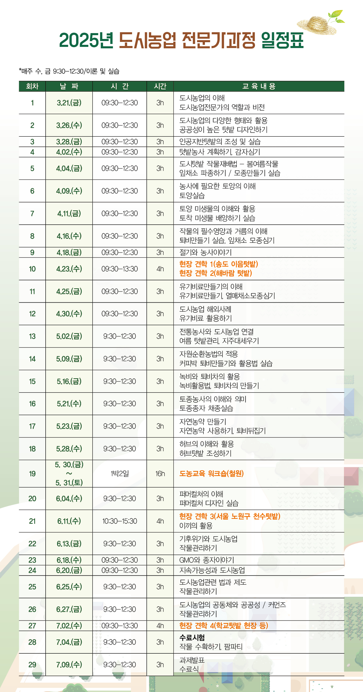 - 도시농업 관련이론, 경작기술, 기반조성, 친환경농사, 관련법령 및 제도, 프로그램, 평가, 워크샵, 견학 등