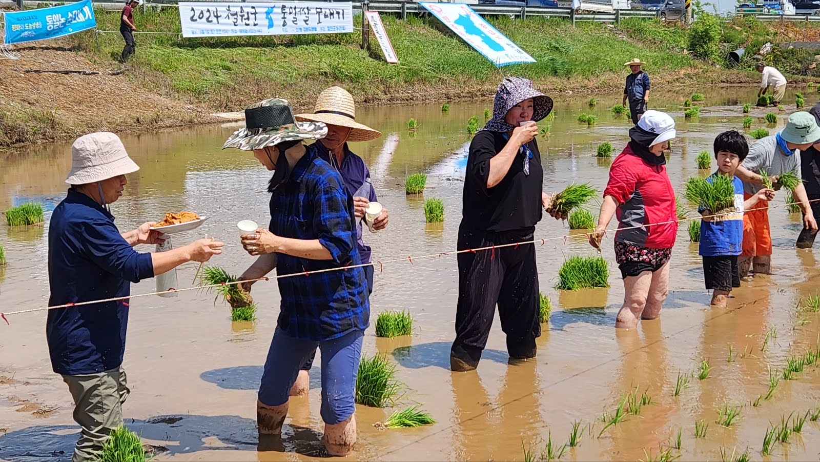 매번 느끼는 거지만 넓은 들녘에서 많은 사람들이 북적북적대는 것만으로도 신이난다. 게다가 이날은 날도 좋아 너무 덥지도 않고, 하늘이 맑아 논 물에 비친 푸른 빛과 함께 멋진 풍경이 저절로 만들어졌다. 철원군 농민회는 매년 이곳에서 생산된 쌀을 통일을 앞당기는데 사용하고 있다. 원래는 수확한 쌀을 북녘으로 보내주는 것이 맞지만, 민간차원의 지원도 못하게 된지 오래되었다. 그래서 수확물 판매금액을 관련한 곳에 후원하기로 하면서 작년에는 제일 조선학교에 후원금을 보냈다.