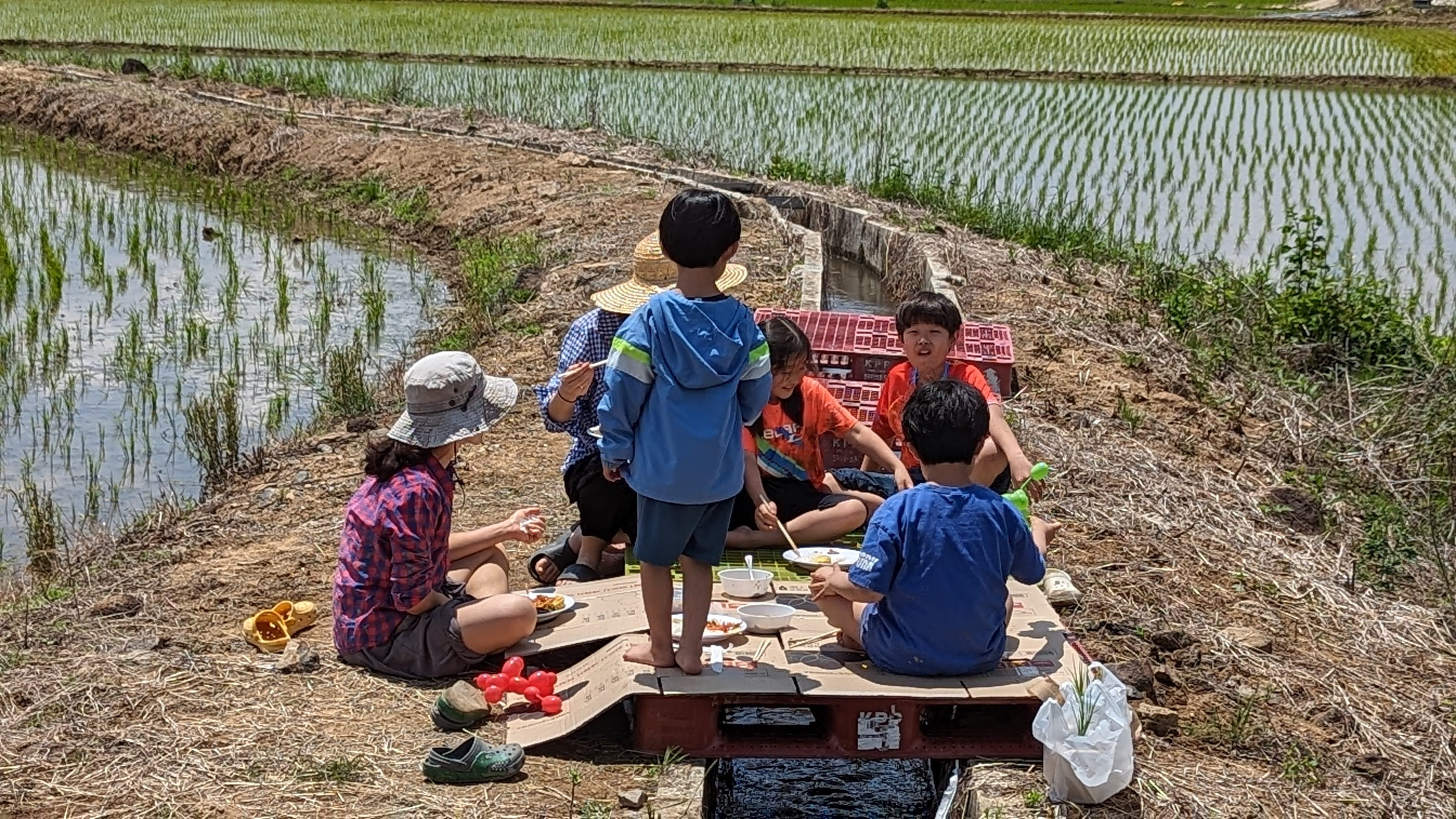 50여 명이 한꺼번에 들어가 모를 내니, 생각보다 일찍 모내기를 마쳤다. 이제 철원의 자랑 '대작' 막걸리도 나누어 마시고, 농민회에서 준비한 식사도 함께 하면서 교류하는 시간. 들에서 먹는 밥이 얼마나 맛있었는지, 3년째 참여하는 어느 도시농부는 "다리가 불편해서 모는 제대로 못내지만, 밥 먹으러 왔다"면서 함께 밥먹는 즐거움을 놓치기 싫었다고 했다.