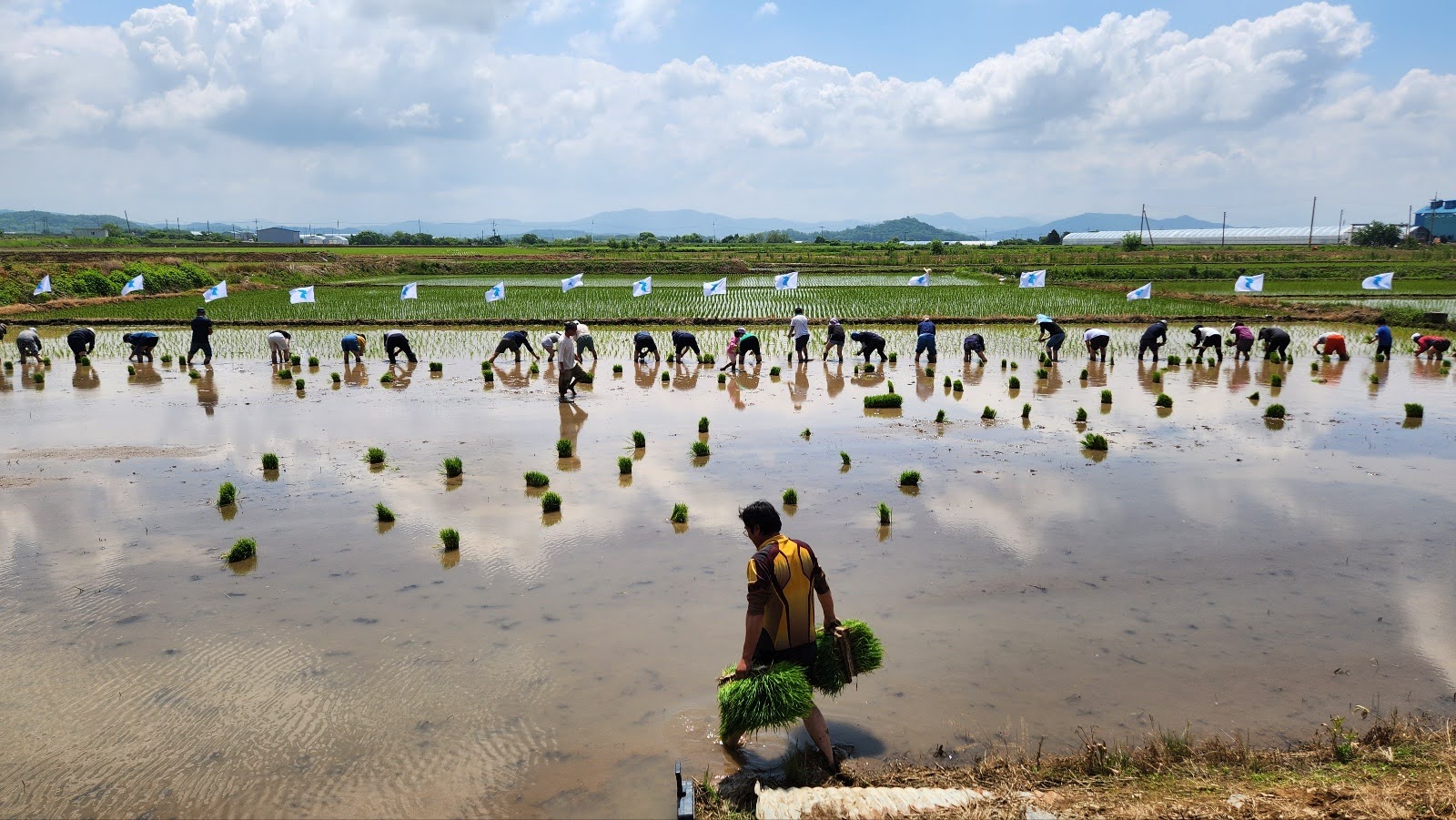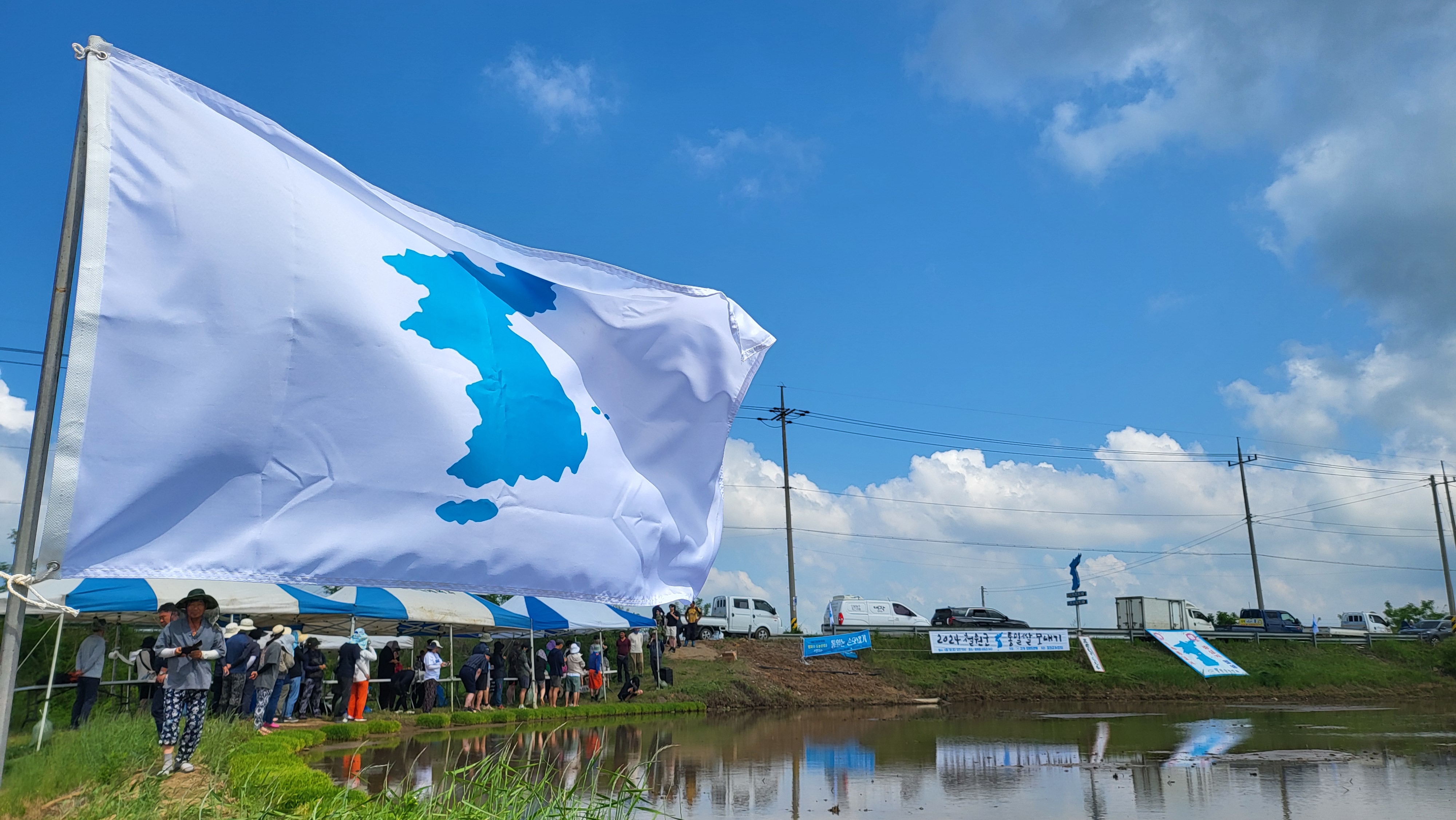 매번 느끼는 거지만 넓은 들녘에서 많은 사람들이 북적북적대는 것만으로도 신이난다. 게다가 이날은 날도 좋아 너무 덥지도 않고, 하늘이 맑아 논 물에 비친 푸른 빛과 함께 멋진 풍경이 저절로 만들어졌다. 철원군 농민회는 매년 이곳에서 생산된 쌀을 통일을 앞당기는데 사용하고 있다. 원래는 수확한 쌀을 북녘으로 보내주는 것이 맞지만, 민간차원의 지원도 못하게 된지 오래되었다. 그래서 수확물 판매금액을 관련한 곳에 후원하기로 하면서 작년에는 제일 조선학교에 후원금을 보냈다.