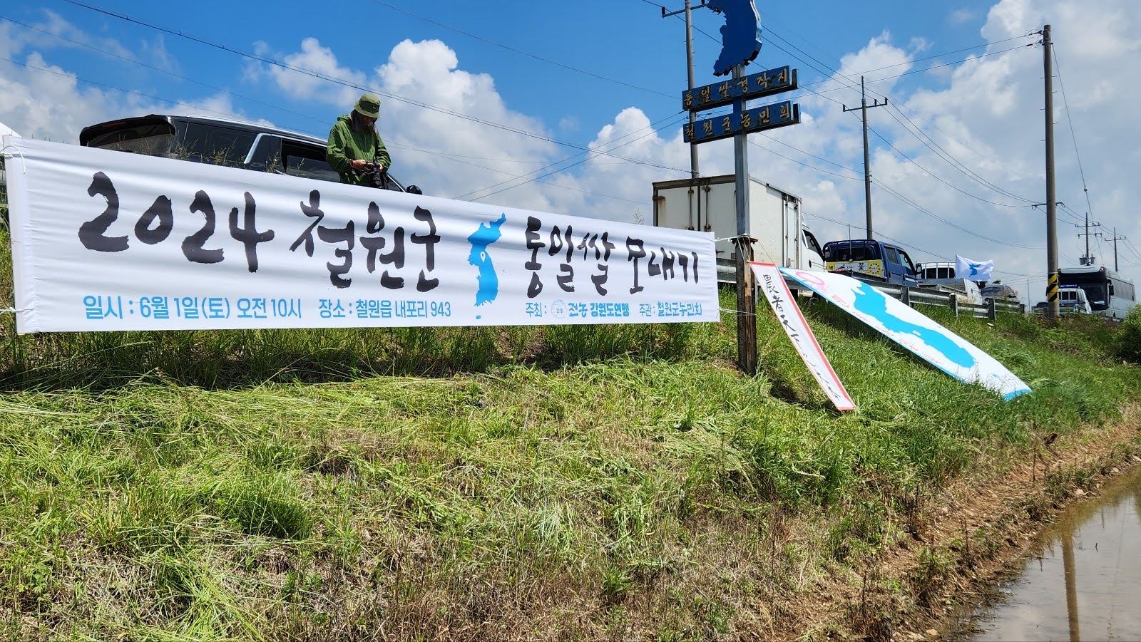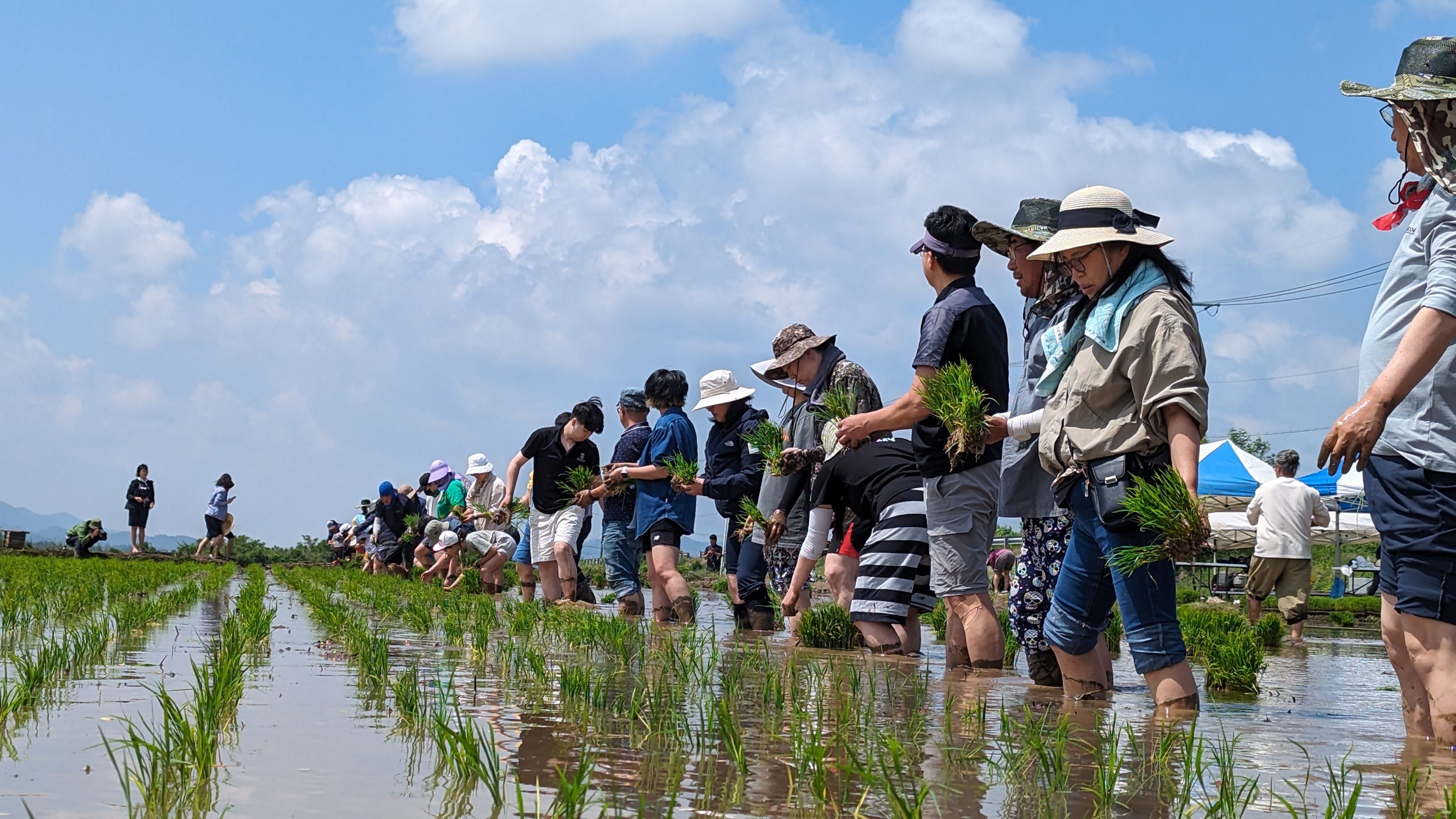 매번 느끼는 거지만 넓은 들녘에서 많은 사람들이 북적북적대는 것만으로도 신이난다. 게다가 이날은 날도 좋아 너무 덥지도 않고, 하늘이 맑아 논 물에 비친 푸른 빛과 함께 멋진 풍경이 저절로 만들어졌다. 철원군 농민회는 매년 이곳에서 생산된 쌀을 통일을 앞당기는데 사용하고 있다. 원래는 수확한 쌀을 북녘으로 보내주는 것이 맞지만, 민간차원의 지원도 못하게 된지 오래되었다. 그래서 수확물 판매금액을 관련한 곳에 후원하기로 하면서 작년에는 제일 조선학교에 후원금을 보냈다.