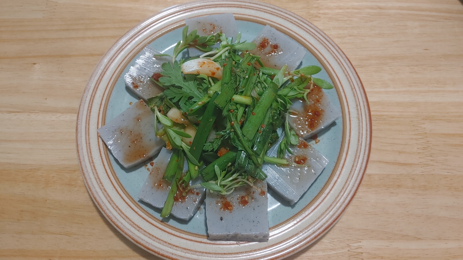 8. 접시에 올방개묵을 깔고 위에 부추무침을 올린다.