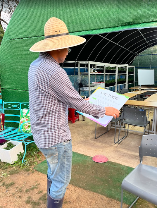 왼쪽은 왼쪽은 전국도시농업관리사연합회의 이정호 이사장님(왼쪽) 농장 입구에 방문을 환영하는 현수막이 큼직하게 게시되어 있다. 들어서기 전부터 이렇게 큰 환대라니. 이사장님과 단체의 따듯한 환대는 부산에 있는 내내 이어졌다(오른쪽)
