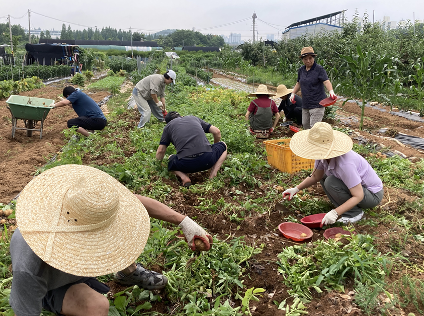 앉았다 일어나면 “어구구~~” 소리가 먼저 나오지만, 회원들 모두 공동밭에 심은 기쁘게 감자를 캤습니다. 이런 모습에서 우리가 공동체임을 느낍니다. 수확한 감자는 일부는 회원들이 나누고, 대부분 장애인무료급식소에 기부하기로 했습니다.