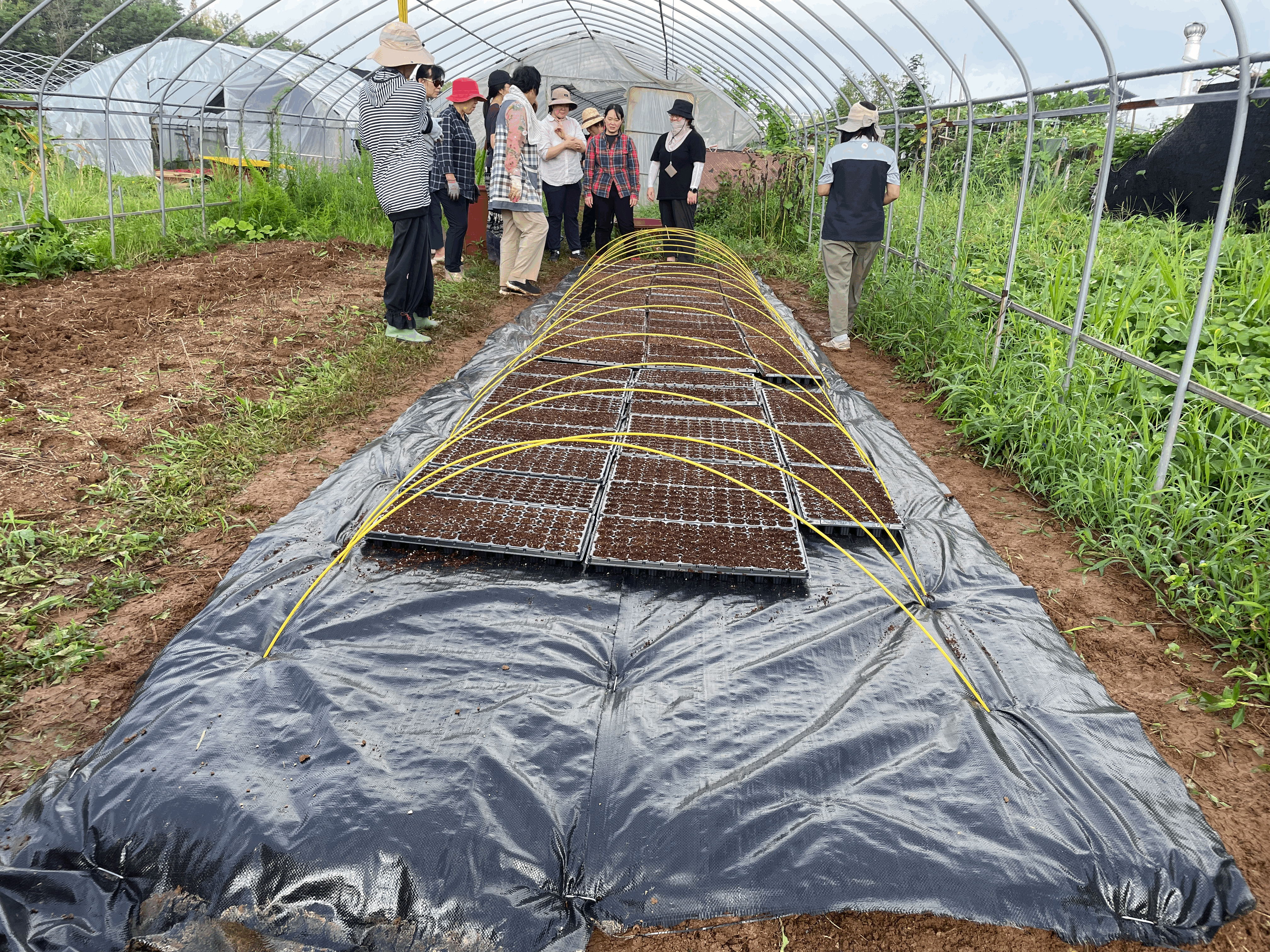 한랭사 설치를 완료하고 물을 주는 당번을 정했습니다. 토종농부들은 일정을 나눠서 물당번을 정했습니다. 콩물과 동치미 육수에 담긴 우뭇가사리를 후루룩 들이키며 두번째 토종농부단 활동이 마무리되었습니다! 약 이주정도 물을 부지런히 주고나면 예쁘게 자라난 배추모종을 만날 수 있겠지요?