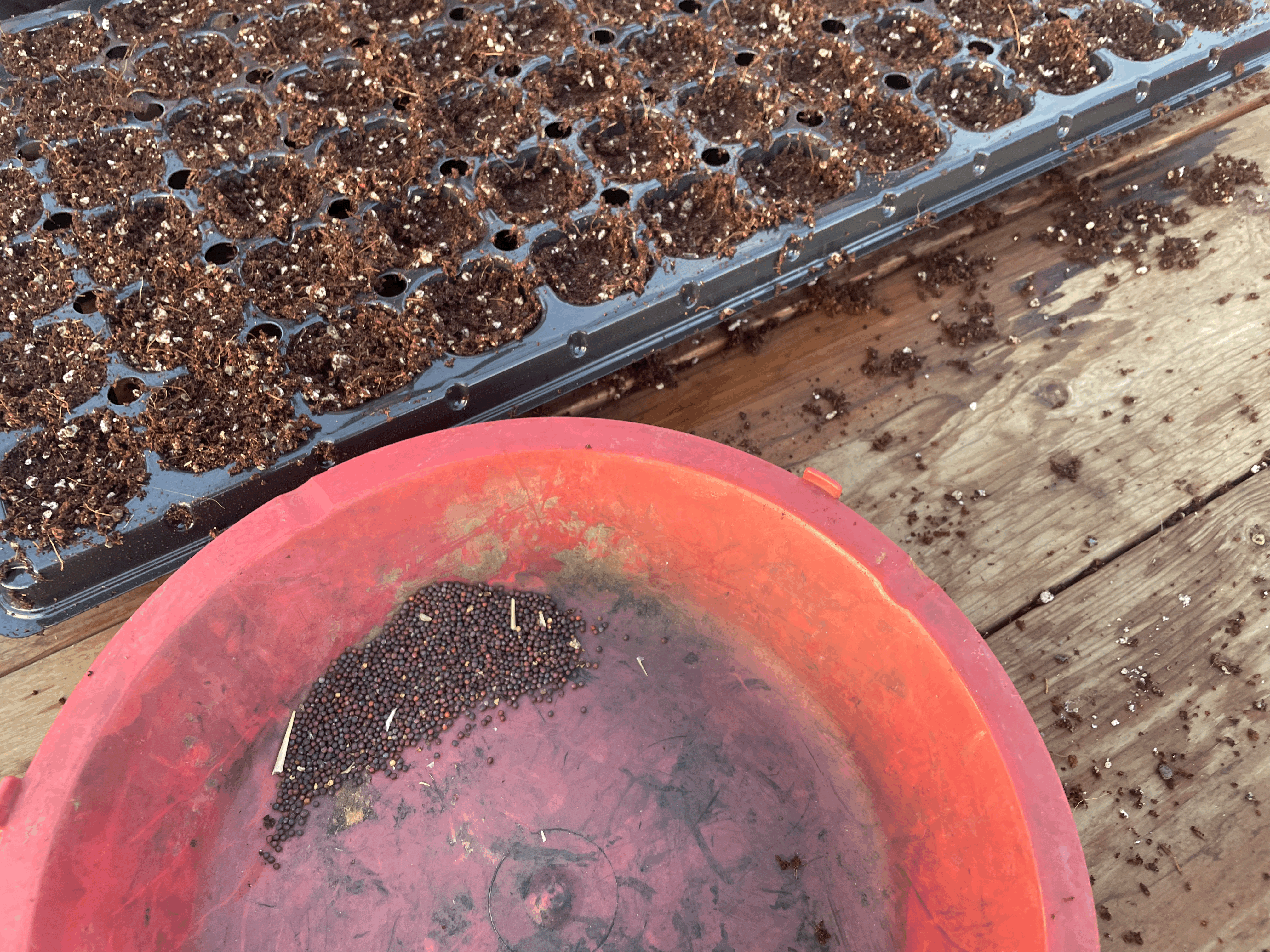 구억배추 모판에는 하얗게 표시를 하여 청방배추 모판과 구분을 해둡니다. 그리고 마대를 깔아서 고정한 평이랑 위에 모판들을 나란히 배치합니다.
