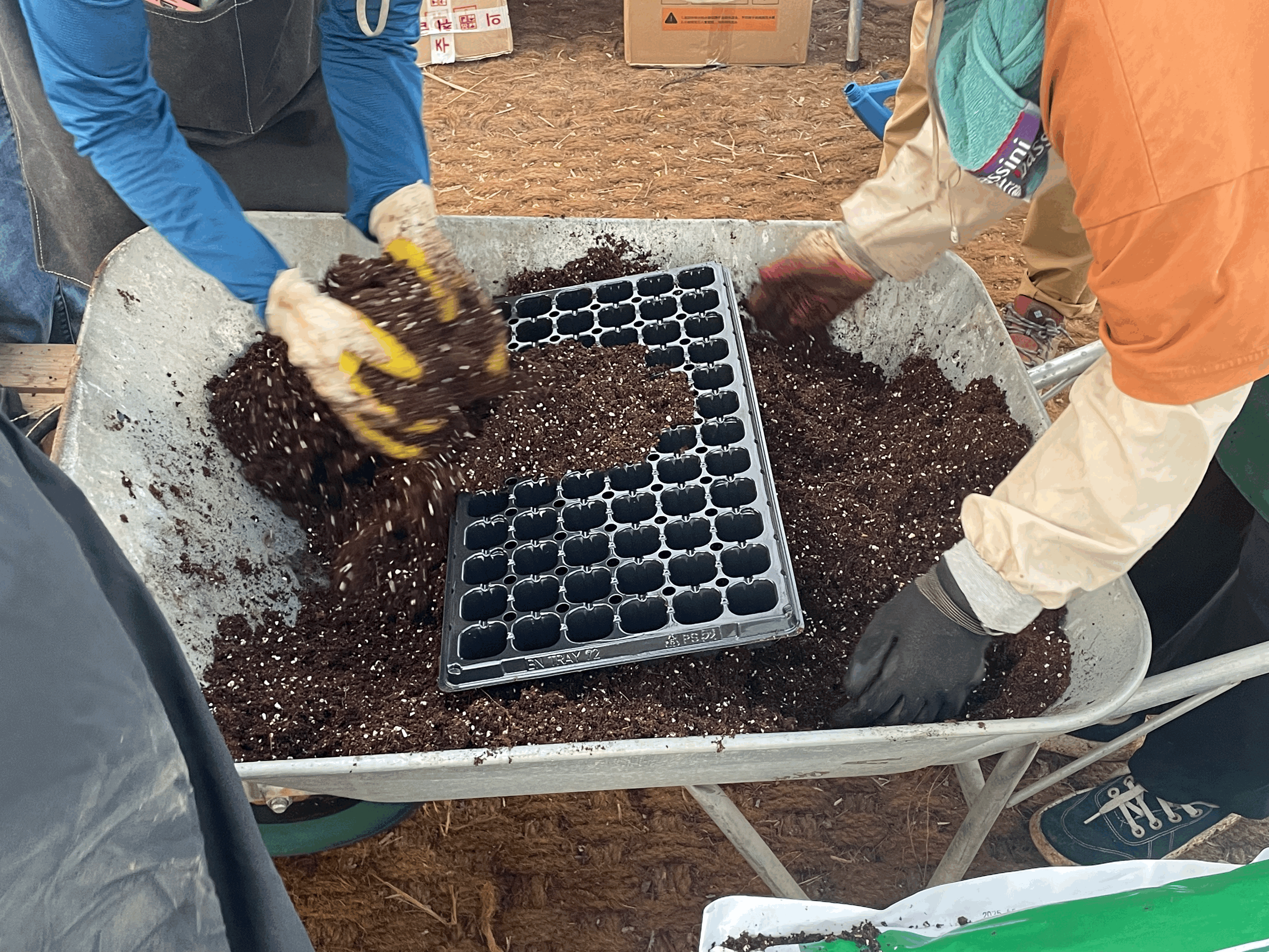 ‘씨앗’에게 구억배추와 청방배추의 특징을 간략히 듣고, 바로 모종 만들기에 들어갔습니다. 모판에 물에 적신 상토를 담고 모판을 위로 쌓아 꾸욱 눌러주면 씨앗이 들어간 자리가 생깁니다.