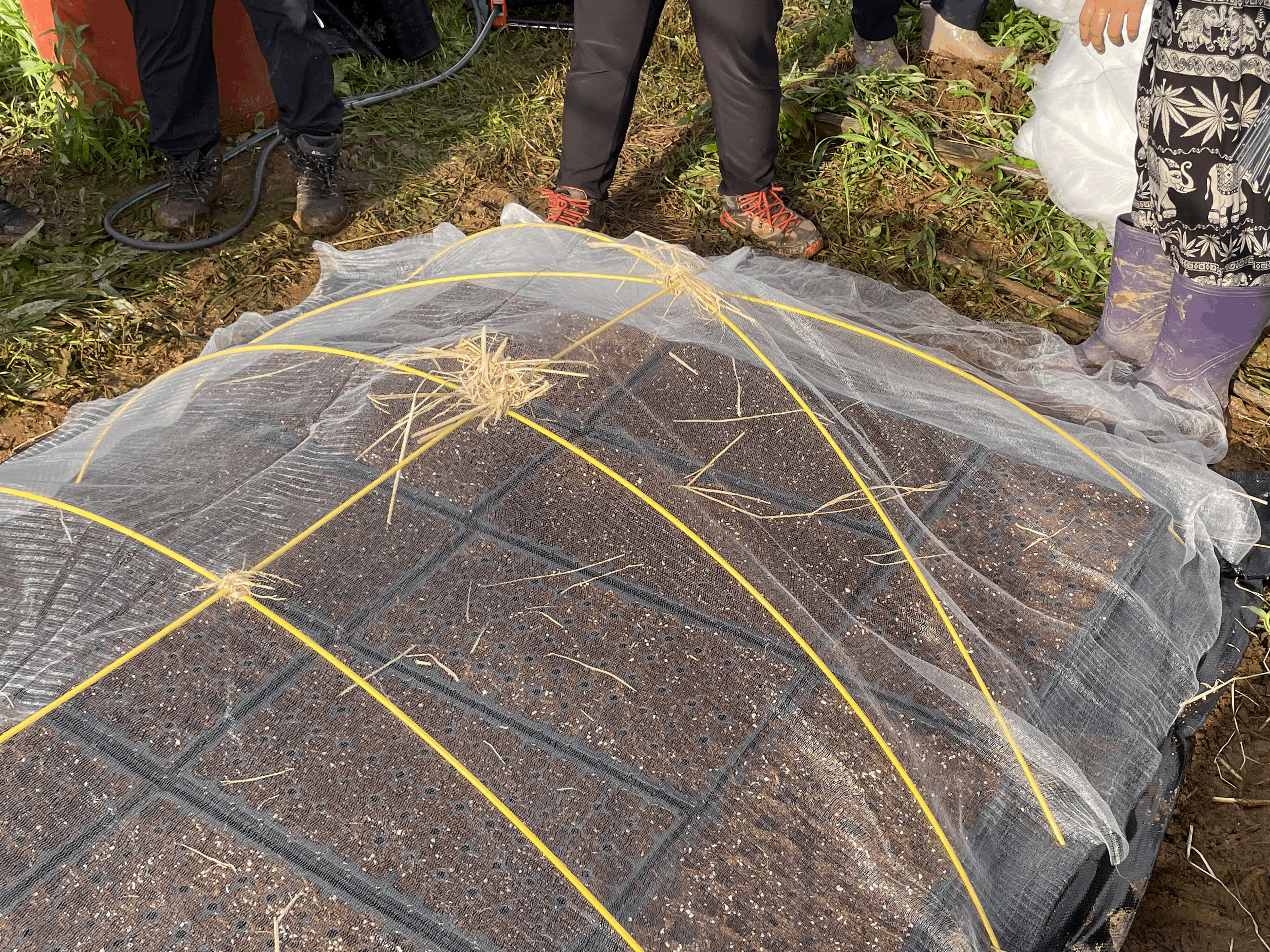 다음으로는 벌레들이 새싹들에 접근하는 것을 막고, 선선한 공기를 유지시켜주기 위해 한랭사를 설치하였습니다. 양쪽 끝에 구멍을 뚫고 활대를 꽂아 아치모양을 만들어줍니다.