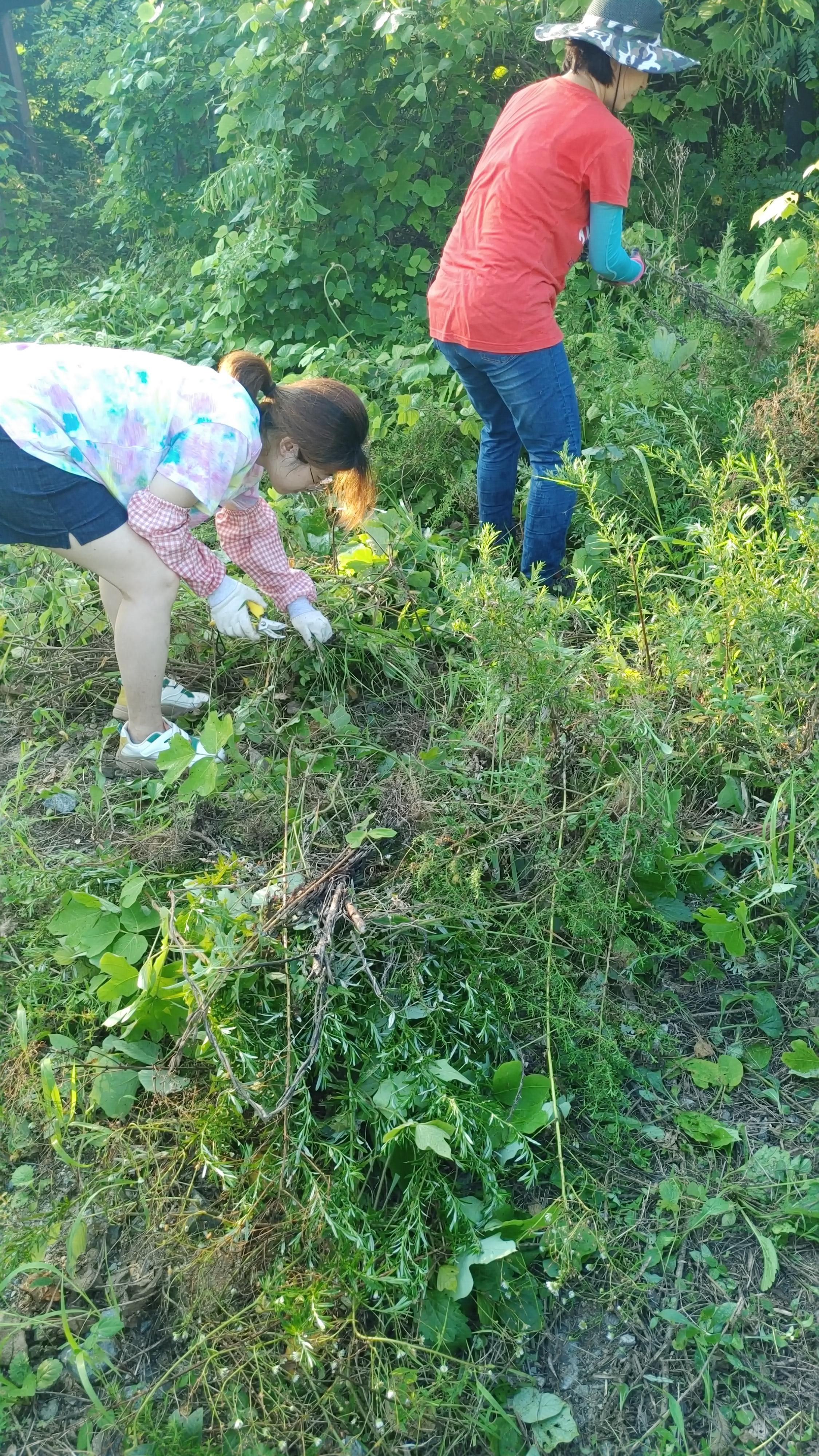 낫으로 허리까지 오는 억센 풀을 베어내고 엉켜 있는 칡덩굴을 가위로 잘라 풀어냈다. 쪼그리고 앉아 잡초를 뽑고 억센 뿌리까지 호미를 이용해 캐냈다. 아침이라도 한낮처럼 햇볕이 강해서 모두 땀을 비 오듯 흘렸고 모기의 공격을 받았다. 더운 날씨라 반바지를 입은 분이 있었는데 다리가 퉁퉁 부을 정도로 모기에 물리기도 했다. 일을 시작하기 전에 몸에 기피제를 뿌렸지만 다들 땀을 많이 흘려서 그런지 소용이 없었다. 내가 워낙 모기에 잘 물리는 사람이라 평소 같으면 십중팔구 나에게 모기가 집중되었을 텐데, 모두가 땀을 흘리니 모두 공평하게 모기밥이 되었다. 고통이 분산된 셈이지만, 나에게 올 모기가 다른 사람에게 간 것 같아서 괜히 미안했다.