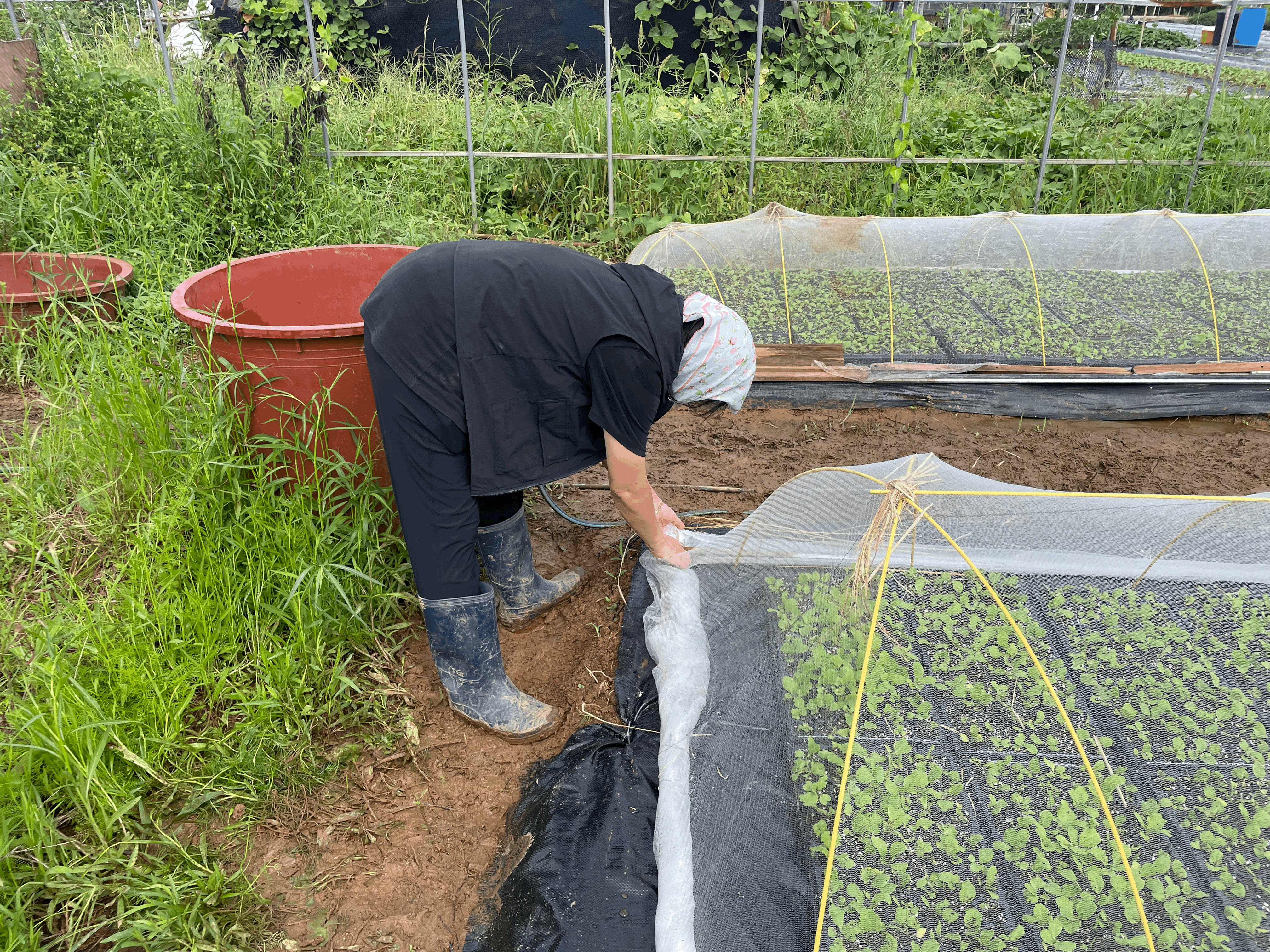 구억배추 솎아주기 작업과 한랭사 설치 작업이 이루어질 무렵, 비구름으로 가려있던 해가 쨍- 하고 비닐하우스위에 나타났습니다.