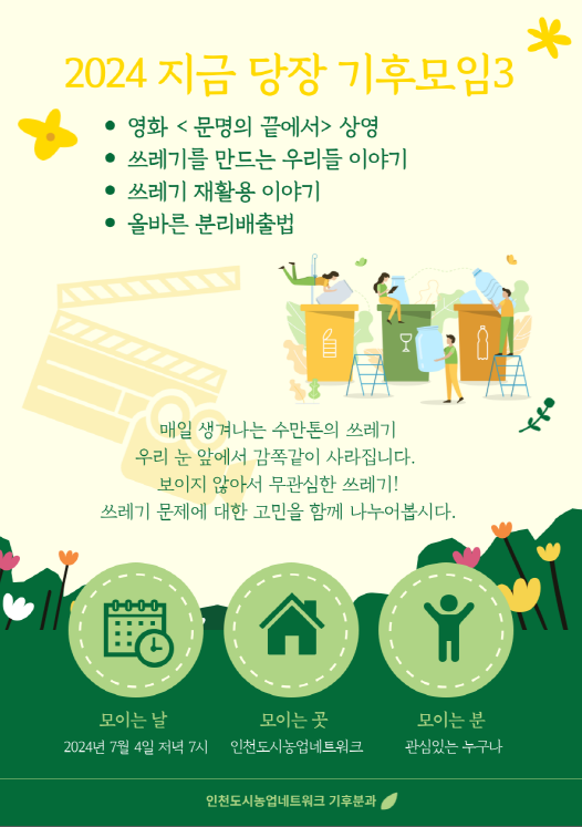 "지구를 살리는 도시농부"를 목표로 지금당장 뭐라도 하고 싶은 도시농부들이 기후를 주제로 정기적으로 모여 공부하고 이야기나누는 모임입니다. 4월 조천호박사 특강과 5월 에너지전환 이야기에 이어 7월 쓰레기를 주제로 모여 이야기나누고 실천도 다져보았습니다. 다음번 모임도 준비되는데로 공지하여 더 많은 분들과 나누는 시간이 되면 좋겠습니다.