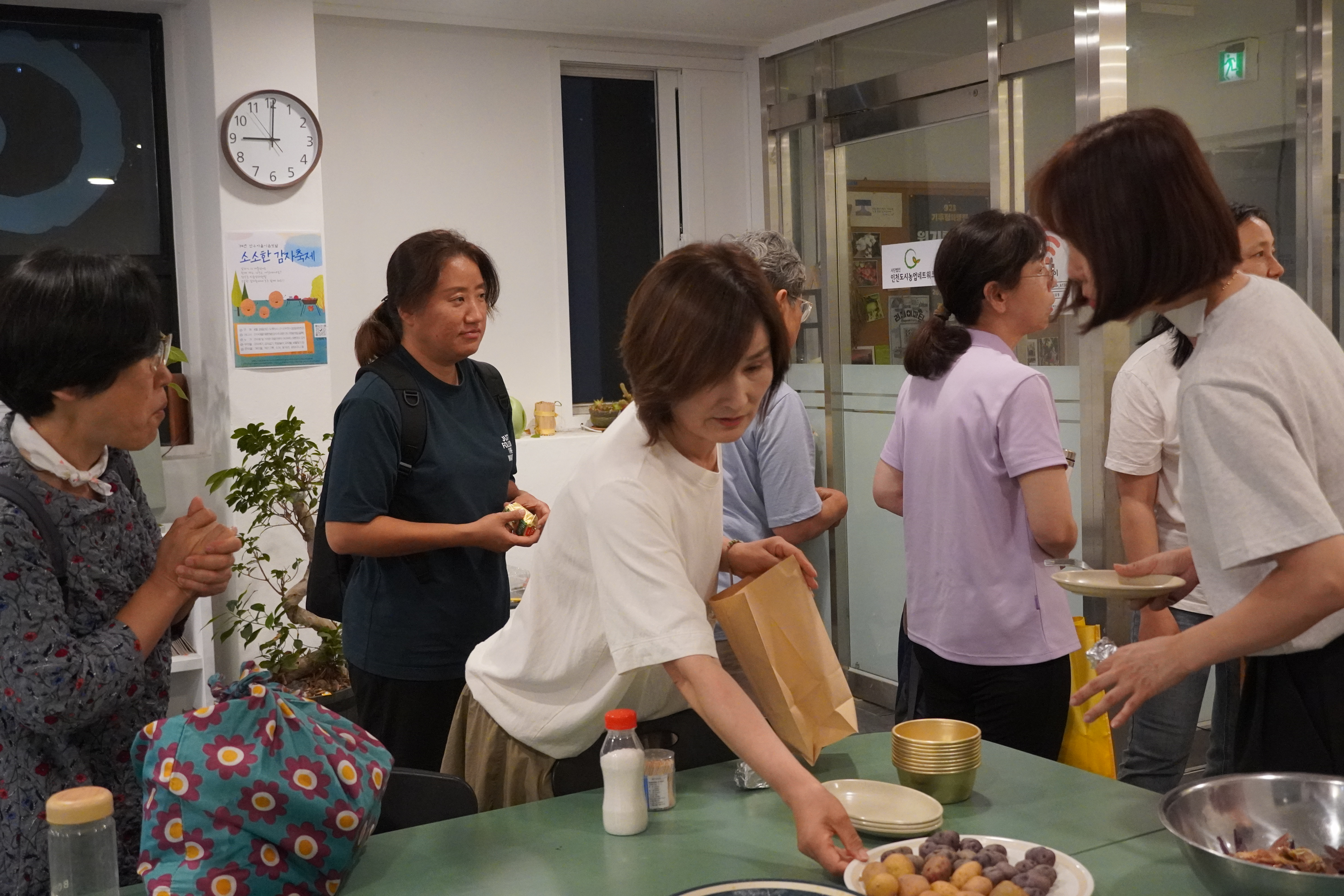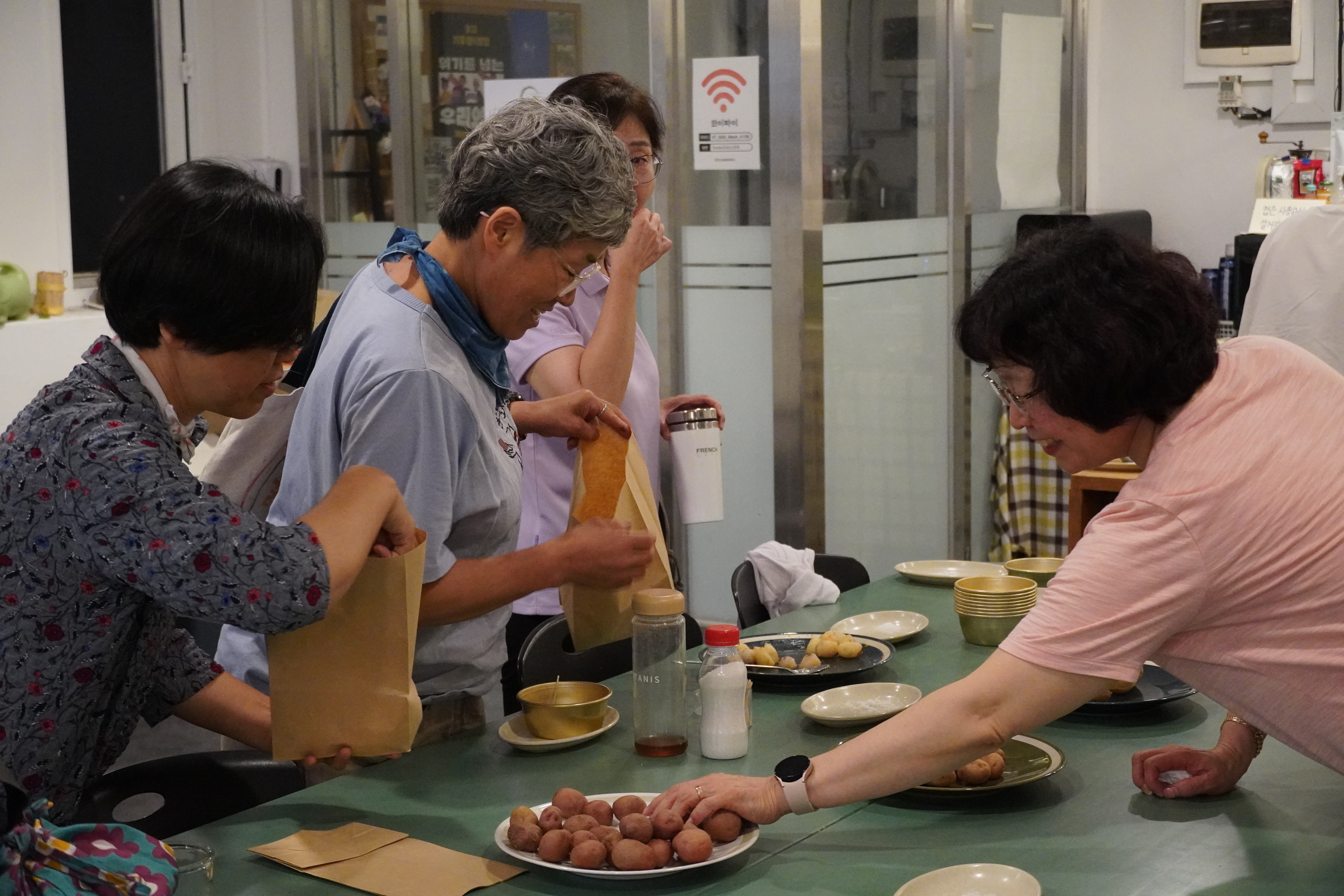 7시가 가까워지자 회원들이 한 두 분씩 모이기 시작했고, 바람(전강희 팀장)이 준비한 토종감자로 준비한 찐감자와 버터구이가 기다리고 있네요. 다들 평소 맛보기 힘든 토종감자로 요기를 하고 교육실에 자리를 잡았습니다.