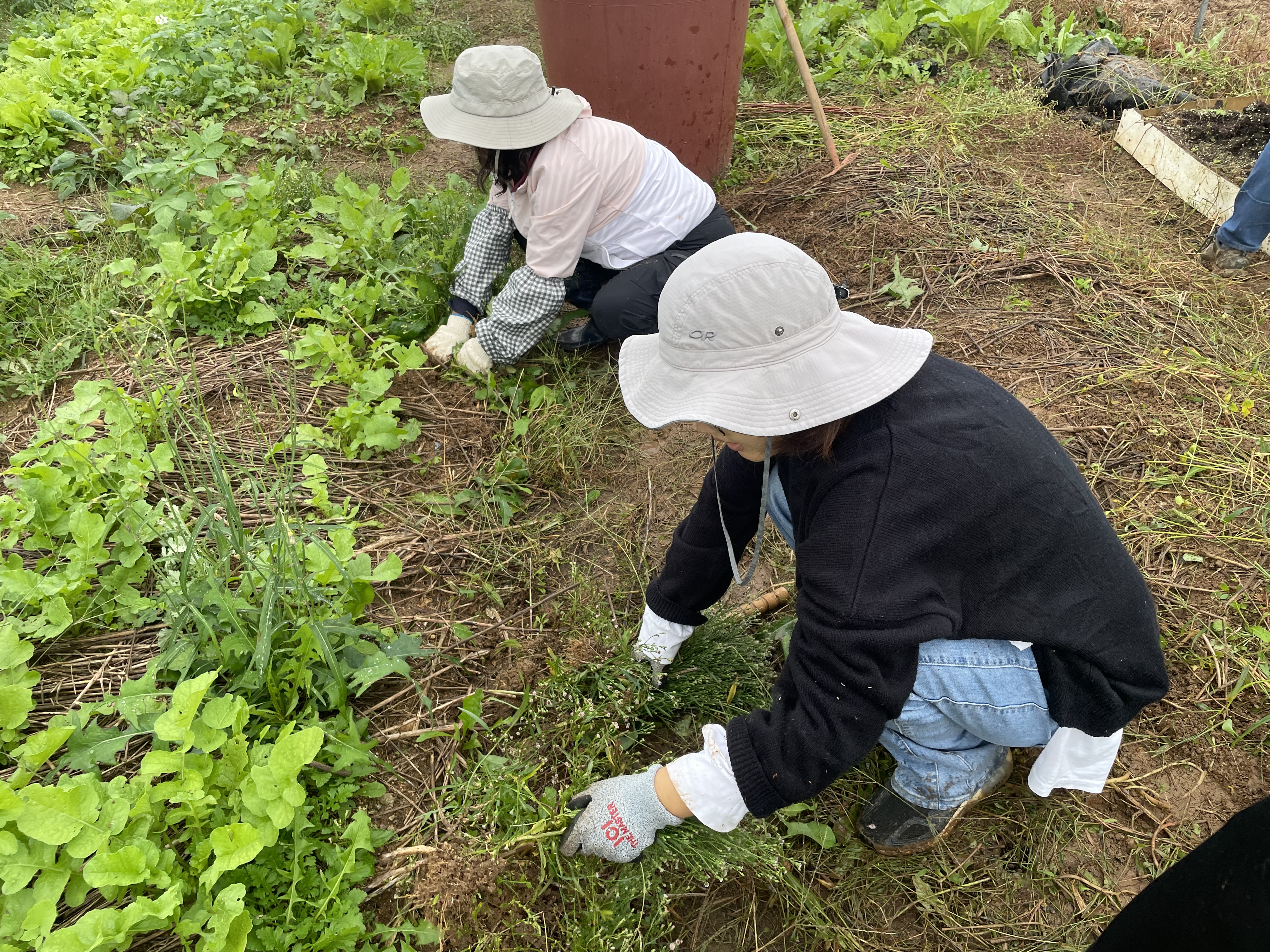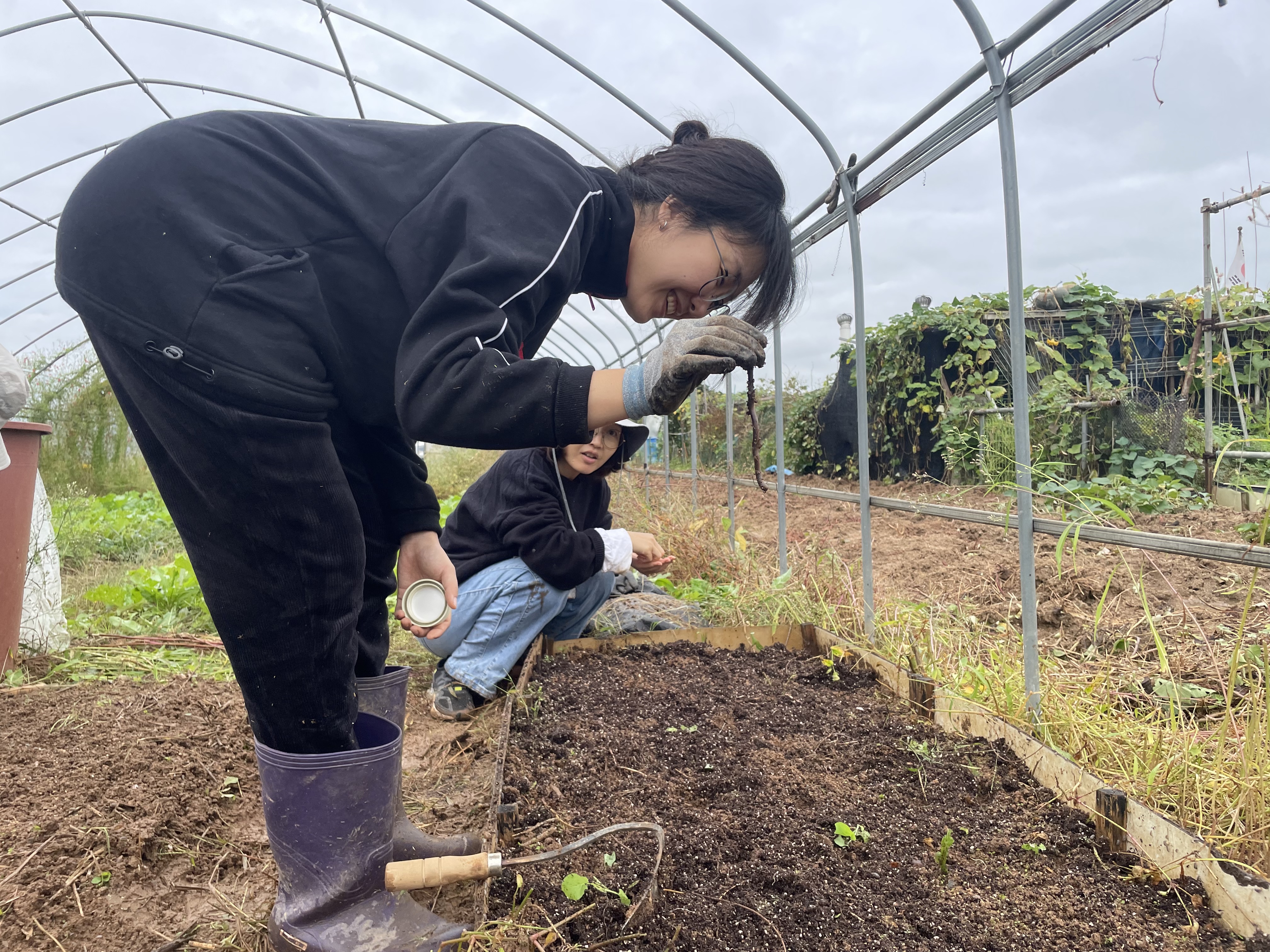 우선 밭에 난 풀들을 베어냈습니다. 비가 와준 덕에 풀들을 베지 않고 쉽게 뽑을 수 있었습니다. 예쁘게 핀 꽃들도 있었고, 무럭무럭 자란 쪽파도 있었는데요. “미안하다~” 하며 다들 밭을 정리했습니다. 아참참 잠자고 있다가 봉변을 당한 지렁이에게도 "미안하다~"해주었습니다.