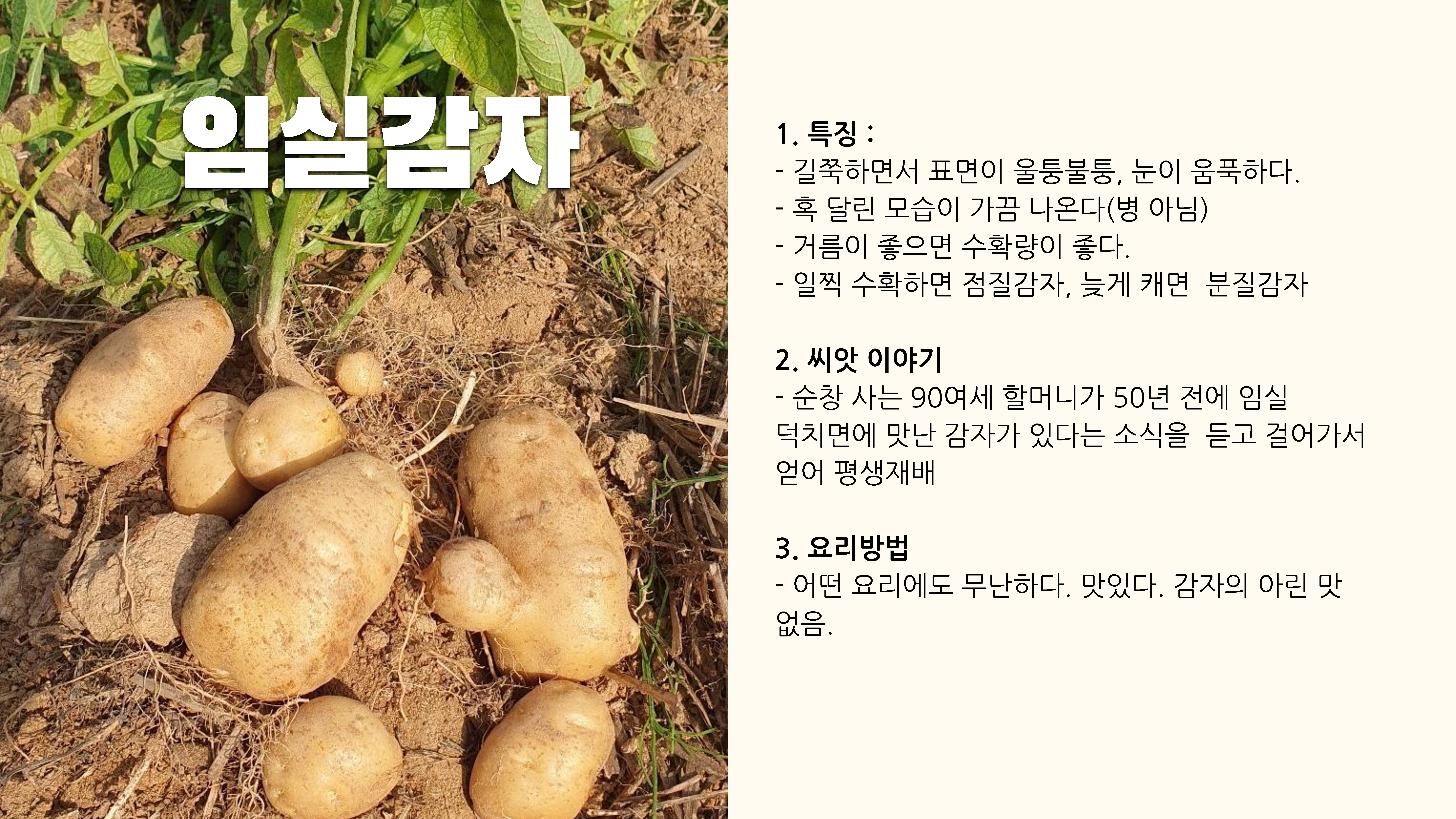 - 토종감자(13품종) : 뻘겅감자, 구남작감자, 눈뻘게감자, 임실감자, 울릉도고무신감자, 자주감자, 육종감자, 원시반본 분홍감자, 속노랑감자, 강화분홍감자, 지게감자, 물감자, 속자주감자