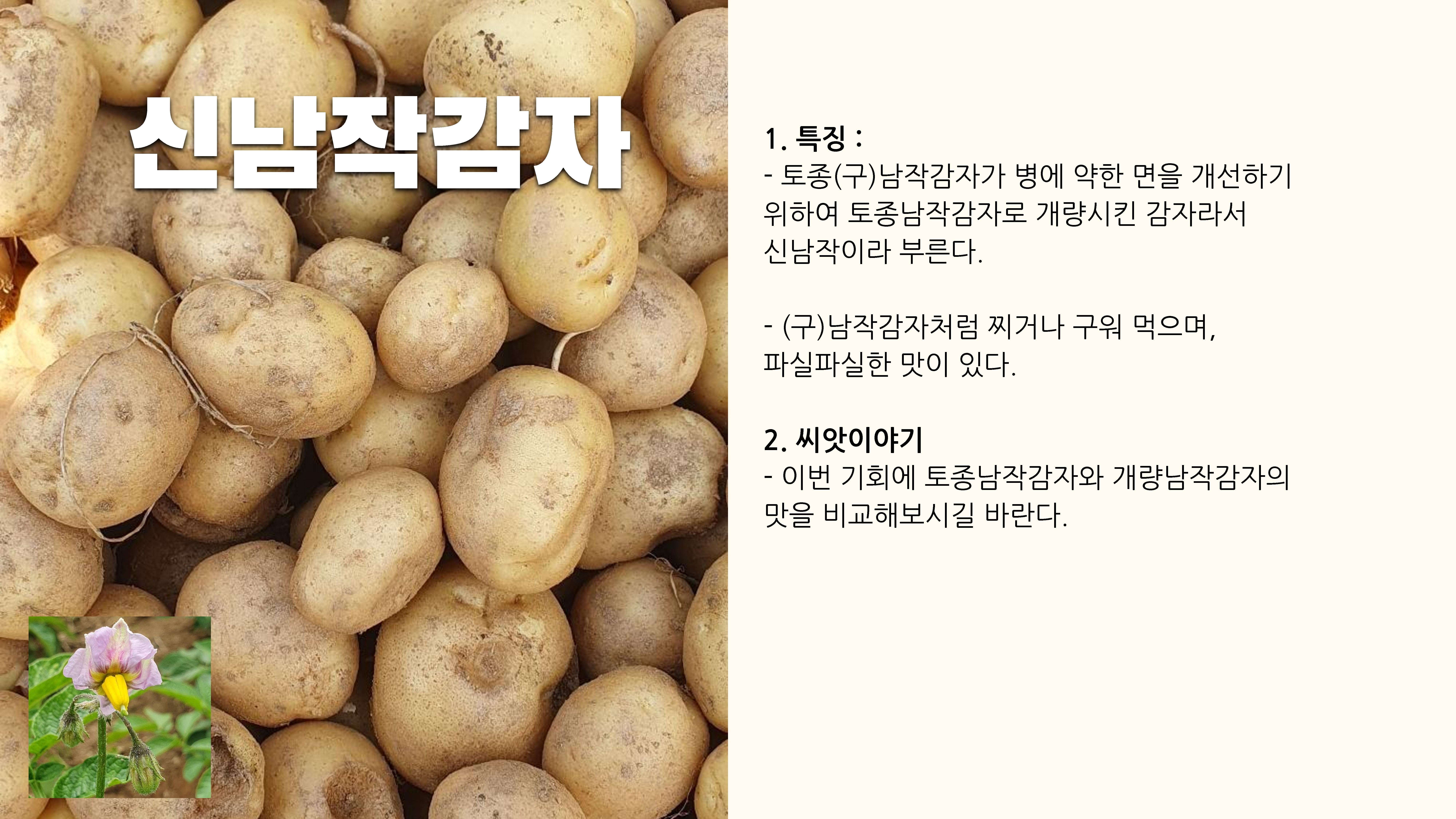 - 한국개량(3품종) : 칠성감자, 신남작감자, 두백감자