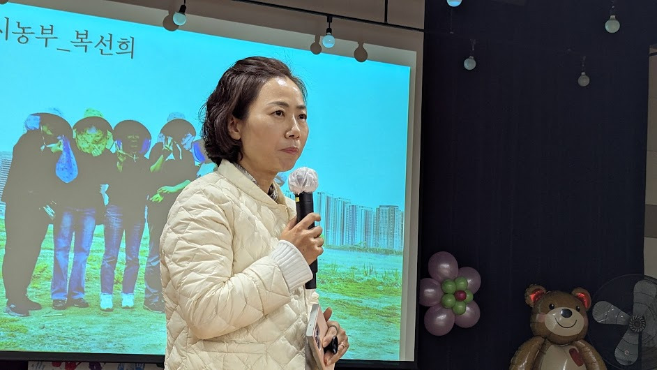 '마을엔 도시농부'의 복선희 님은 공동체를 만들기 위해 용기를 냈던 경험을 나누며 혼자가 아닌 '함께'일 때의 즐거움을 이야기했습니다. 개인 텃밭을 할 때 느꼈던 어려움과 답답함을 공동체 활동을 통해 해결할 수 있었다고 합니다.