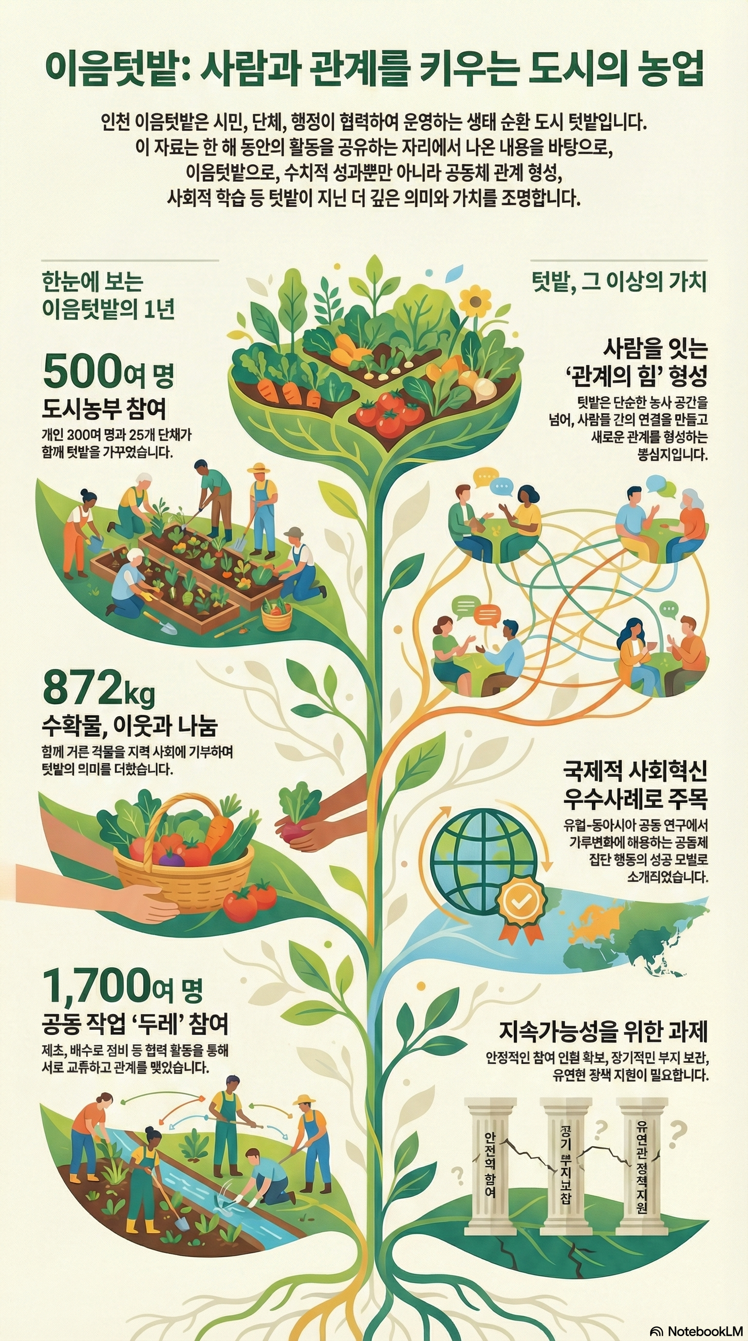 이음텃밭의 가치는 국내를 넘어 세계적인 주목을 받고 있습니다. 최근 이음텃밭은 '공동체 활동을 통한 사회 혁신'을 주제로 한 아시아-유럽 국제 공동 연구 프로젝트의 핵심 연구 사례로 선정되었습니다. 이 연구는 싱가포르, 슬로베니아, 한국의 사례를 비교 분석했으며, 특히 이음텃밭을 '도시농부, 인천도시농업네트워크, 인천시 간의 긴밀한 협력을 통해 만들어진 집단 행동과 사회 혁신의 우수사례'로 높이 평가했습니다. 연구를 통해 공동체 텃밭은 사교적 기술을 강화하고 지속 가능한 생활 방식을 확산시키는 긍정적 효과가 있음이 밝혀졌습니다. 동시에 앞으로 나아가기 위해 해결해야 할 과제들도 제시되었습니다.