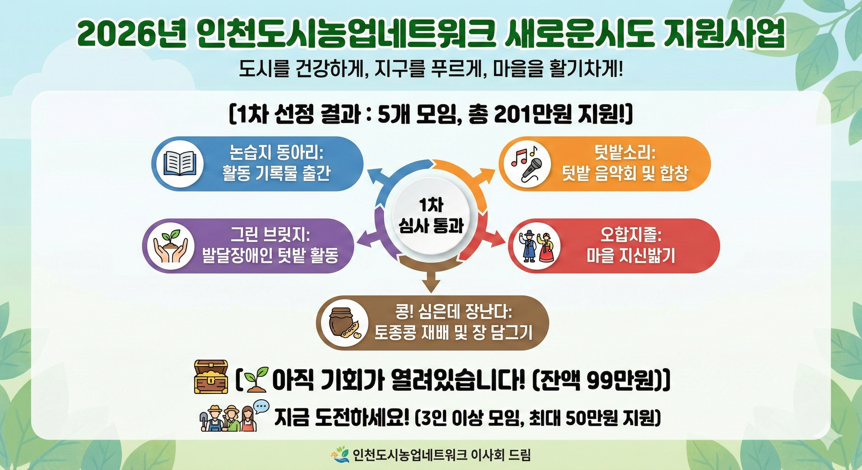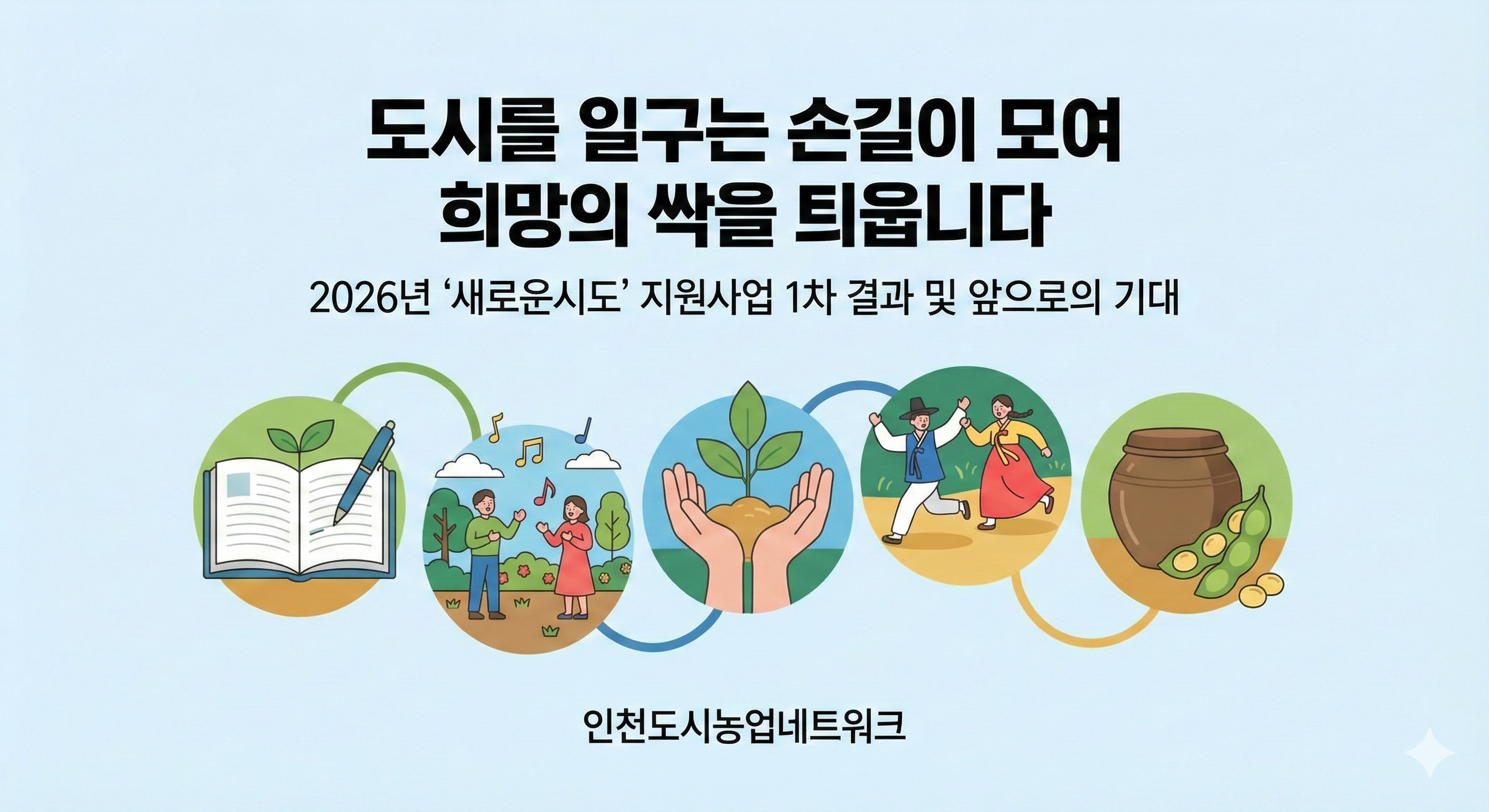 복잡한 서류 절차나 증빙에 대한 부담은 내려놓으셔도 됩니다. 신뢰를 바탕으로 한 이번 사업은 여러분의 활동 내용을 이웃과 즐겁게 나누는 것만으로 충분하니까요. 예산이 소진될 때까지 신청은 상시 열려 있으니, 사무국의 문을 적극적으로 두드려 주세요. 회원 여러분의 손길이 닿는 곳마다 도시가 건강해지고 마을이 살아납니다. 인천도시농업네트워크는 여러분의 모든 ‘새로운 시도’를 언제나 든든하게 응원하겠습니다.