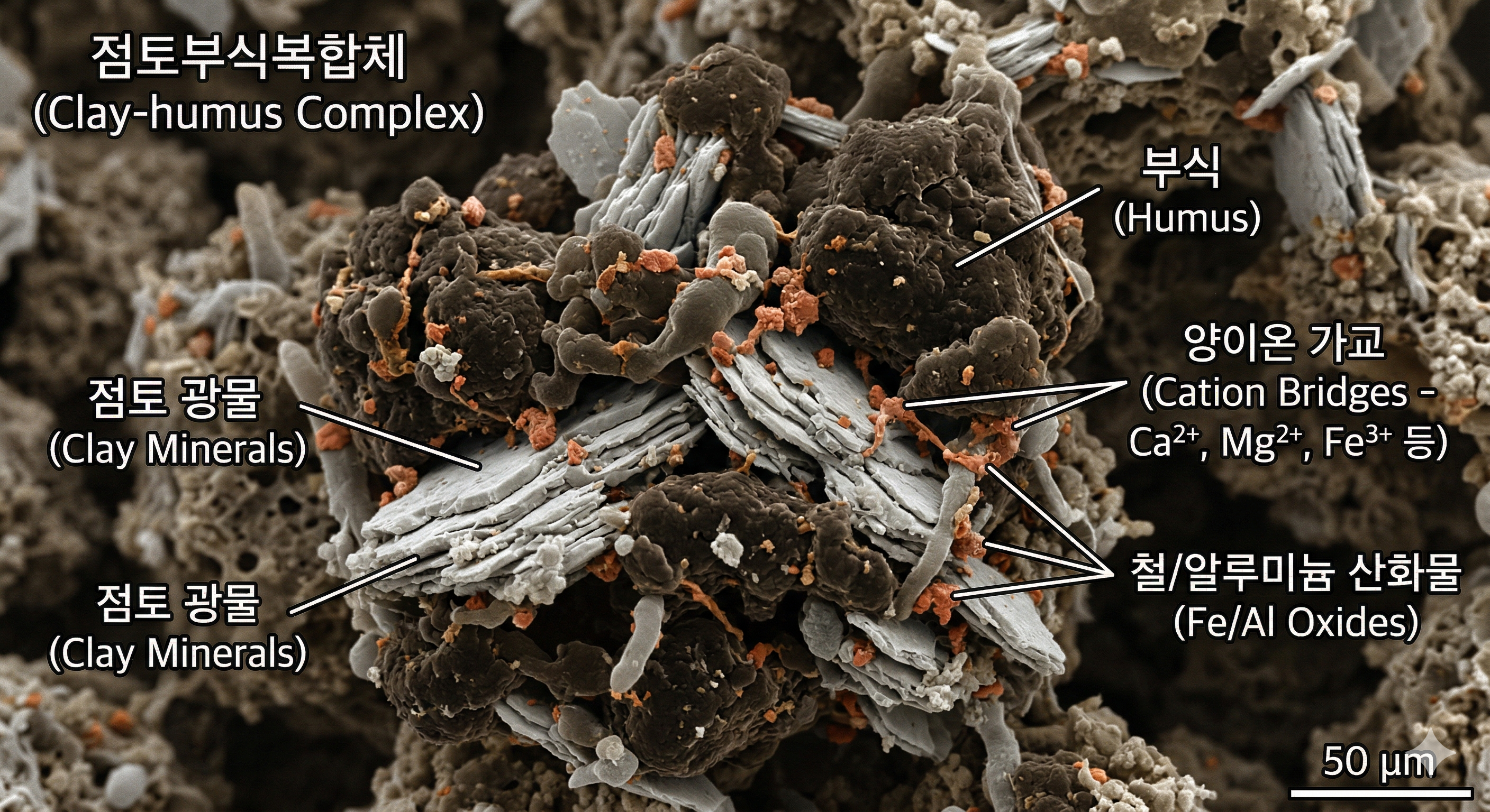 - 핵심 결합 (양이온 가교): 가장 중요한 부분입니다. 이미지 중간중간에 보이는 작은 오렌지색/붉은색 점들과 이들을 연결하는 미세한 실 같은 구조가 바로 양이온 가교(Cation Bridges)입니다. 점토와 부식은 둘 다 음전하(-)를 띠어 서로 밀어내지만, 칼슘(Ca2+), 마그네슘(Mg2+), 철(Fe3+) 같은 2가 이상의 양이온들이 중간에서 다리를 놓아 둘을 단단하게 붙잡아 주고 있습니다.