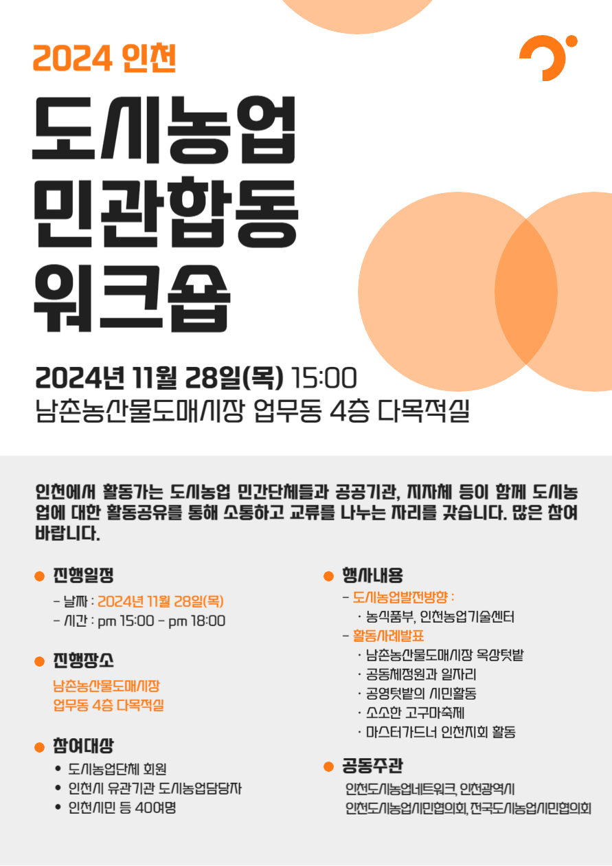 2024 인천도시농업 민관합동 교류 워크샵 안내 (11. 28. 15:00 / 남촌농산물도매시장)
