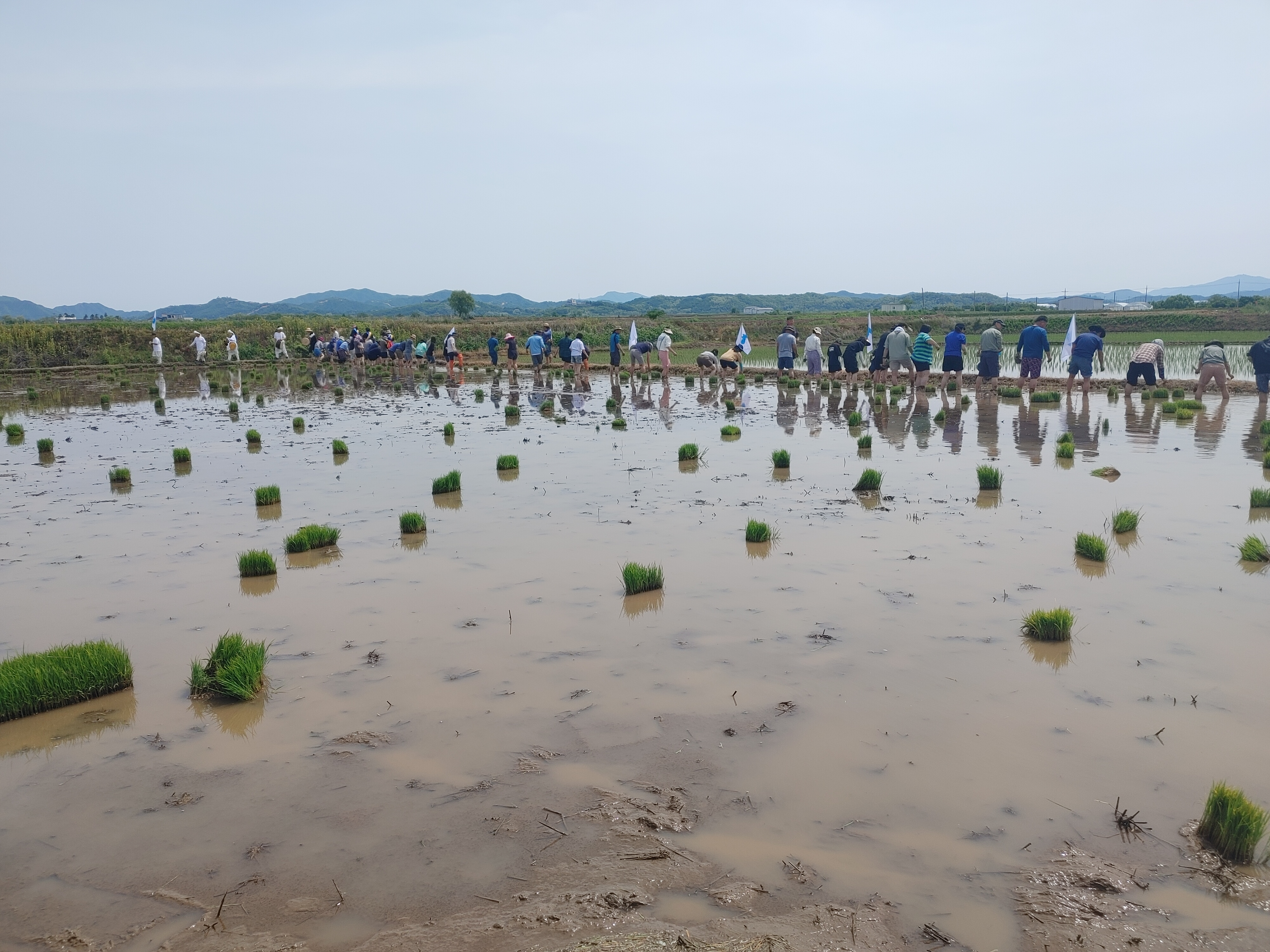 집중력을 발휘하느라 허리 한 번 펴기 힘들었지만, 오른쪽과 왼쪽에 있는 분들과 몇 마디 담소도 나누면서 모내기를 이어나갔다. 모인 인원이 많아서 한 시간도 안 되어 모내기를 끝낼 수 있었다.