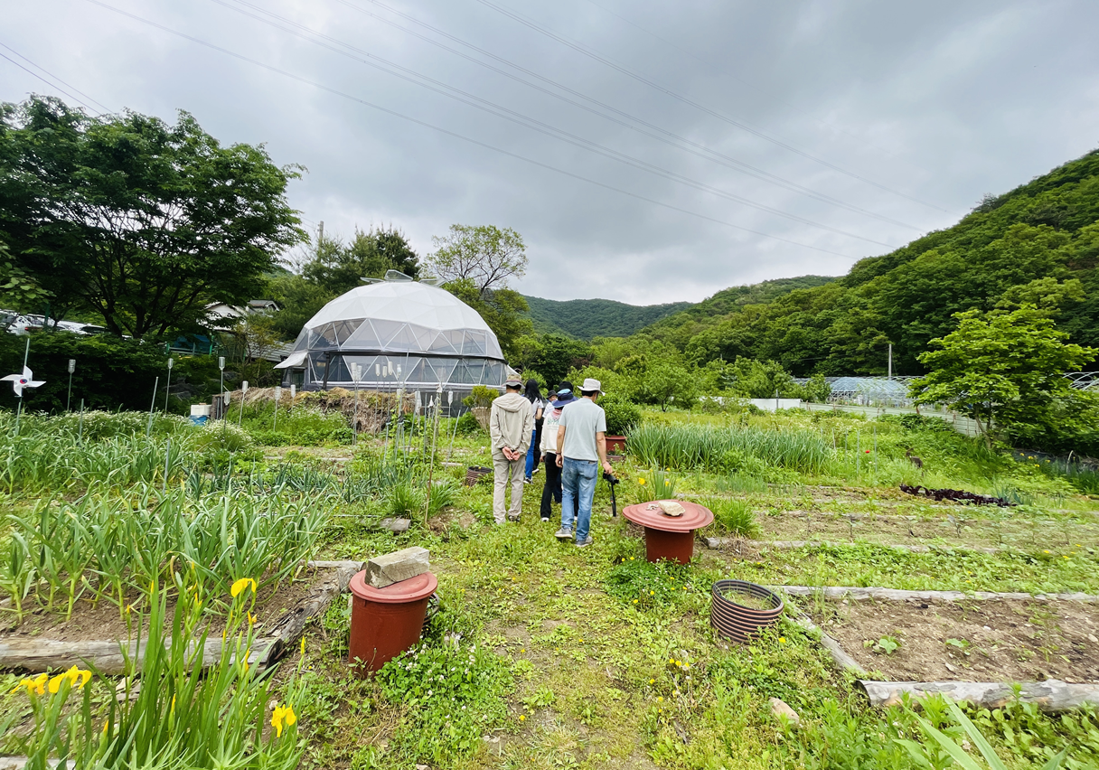 지오돔 안에 둘러앉아 안철환 선생님의 농장과 관련된 재미난 에피소드며 최근 근황을 듣고 궁금한 점을 질문했다. 현재는 진행 중인 퇴비 사업을 꼭 성공하고 싶다고 하셨다.