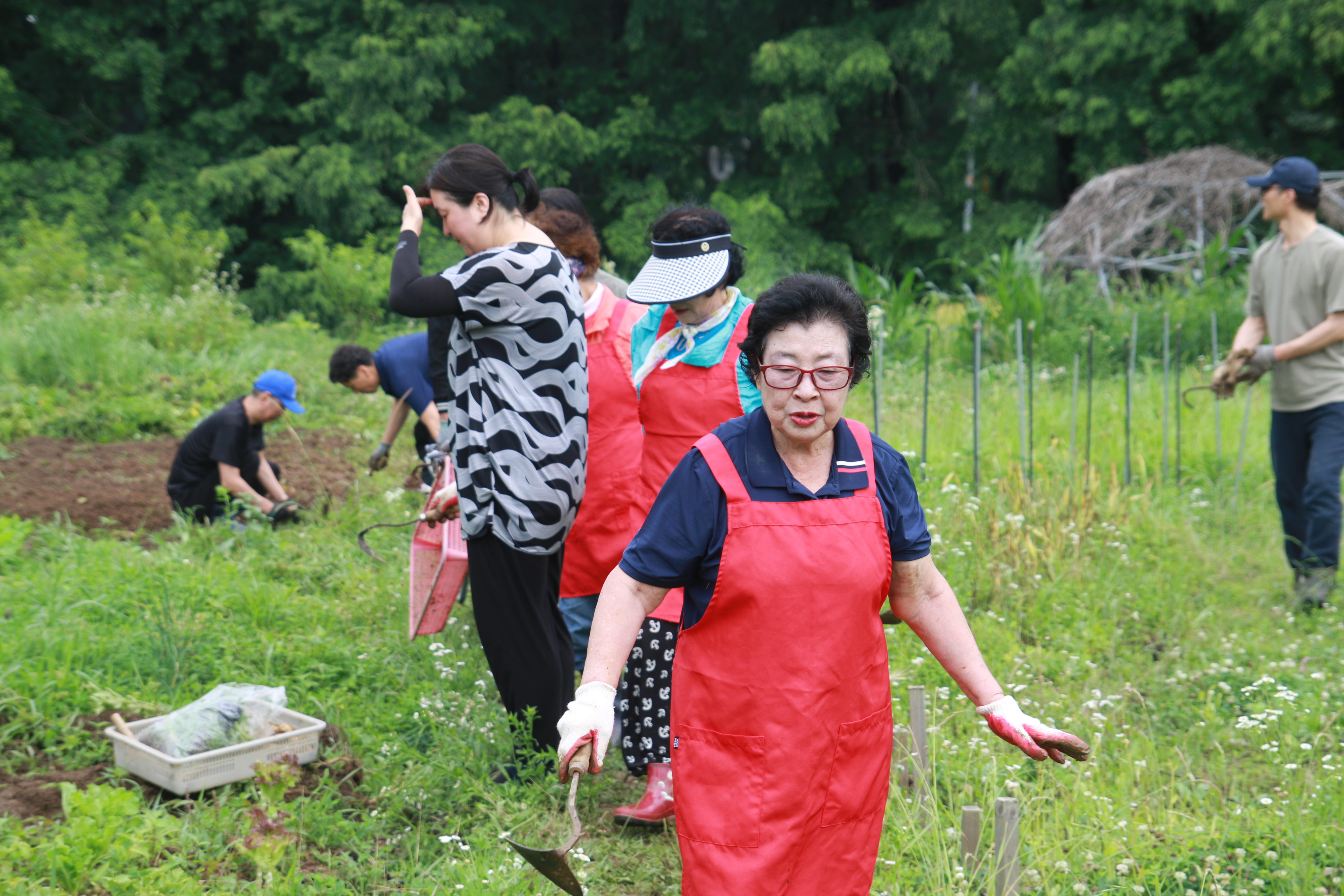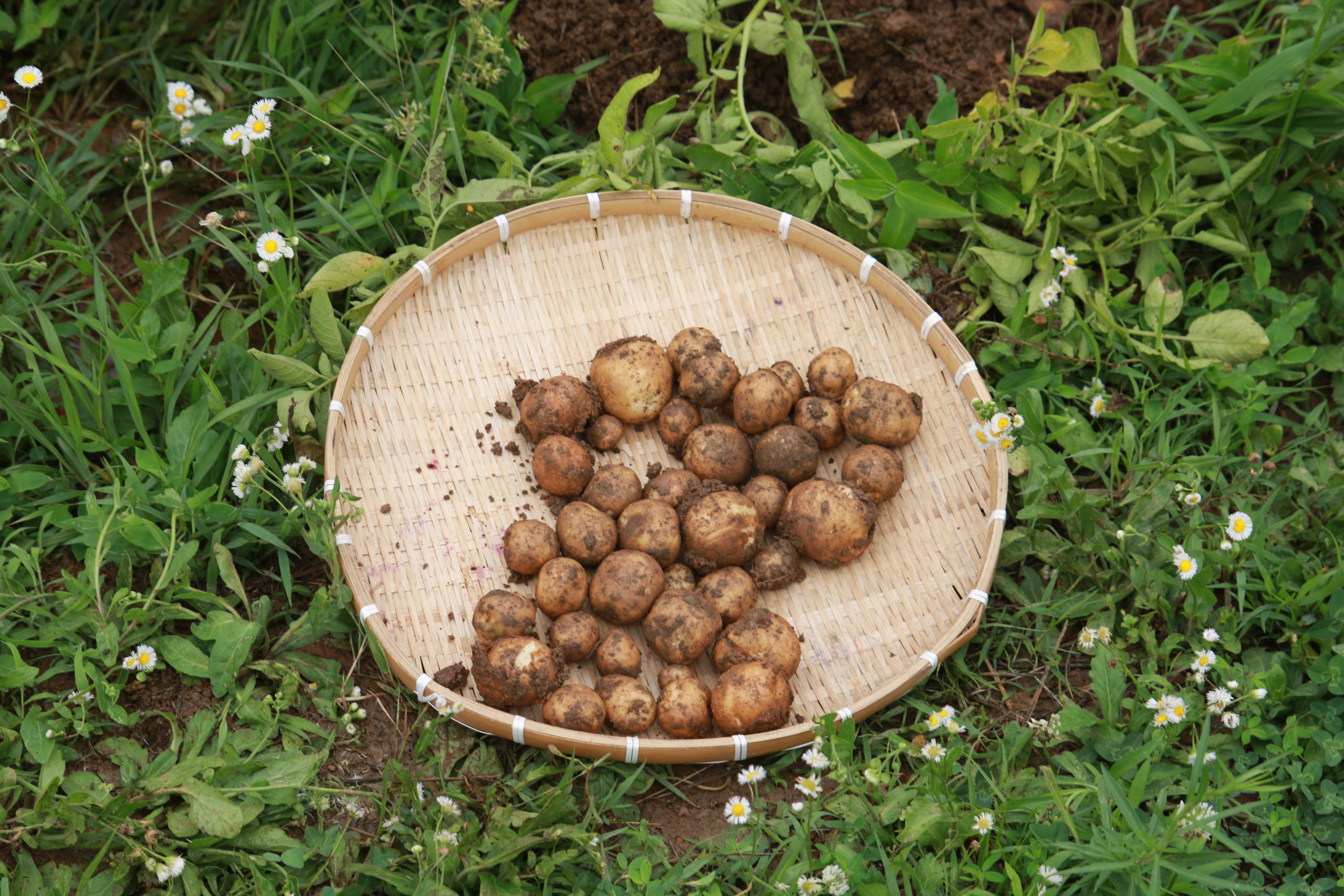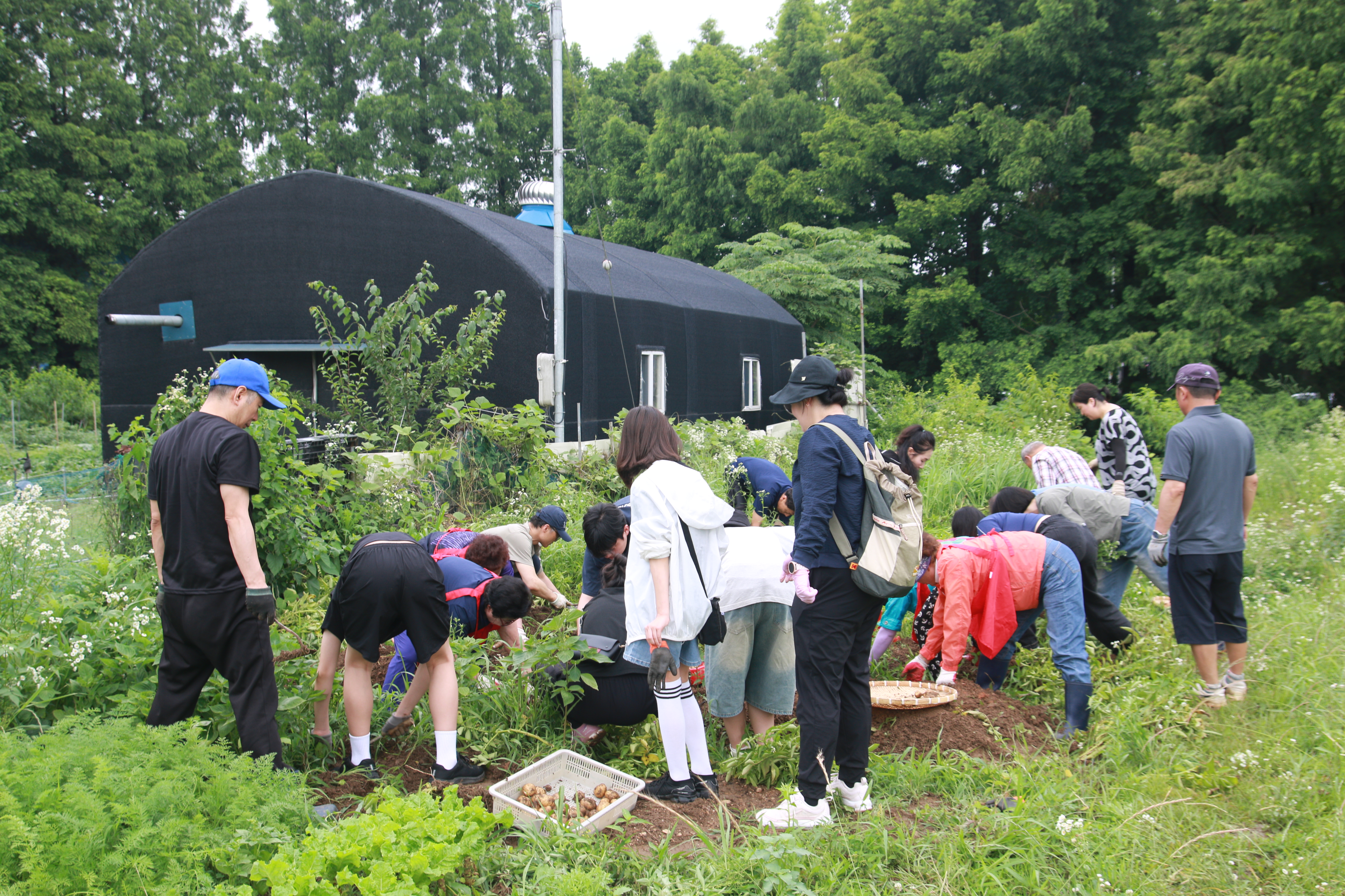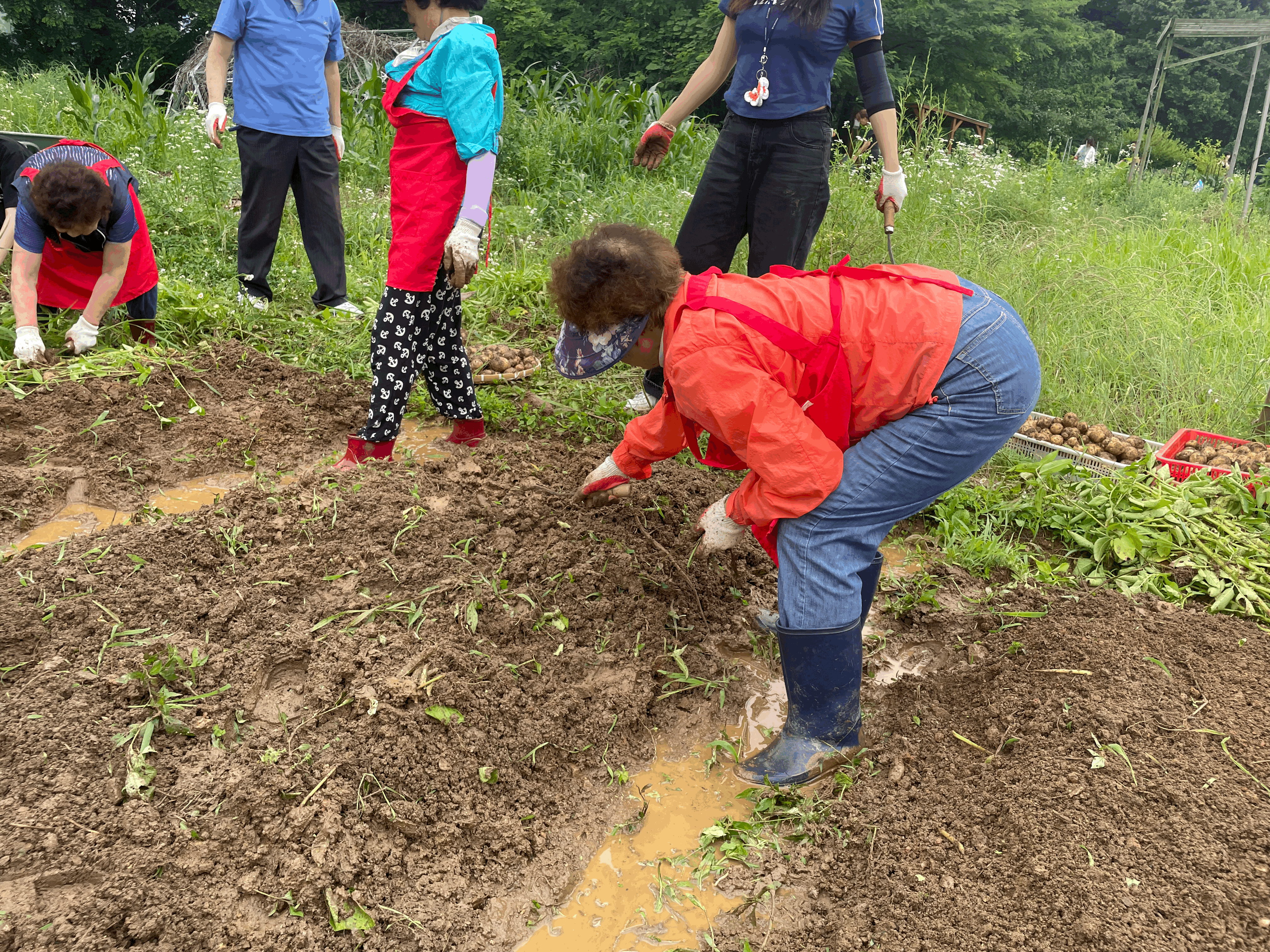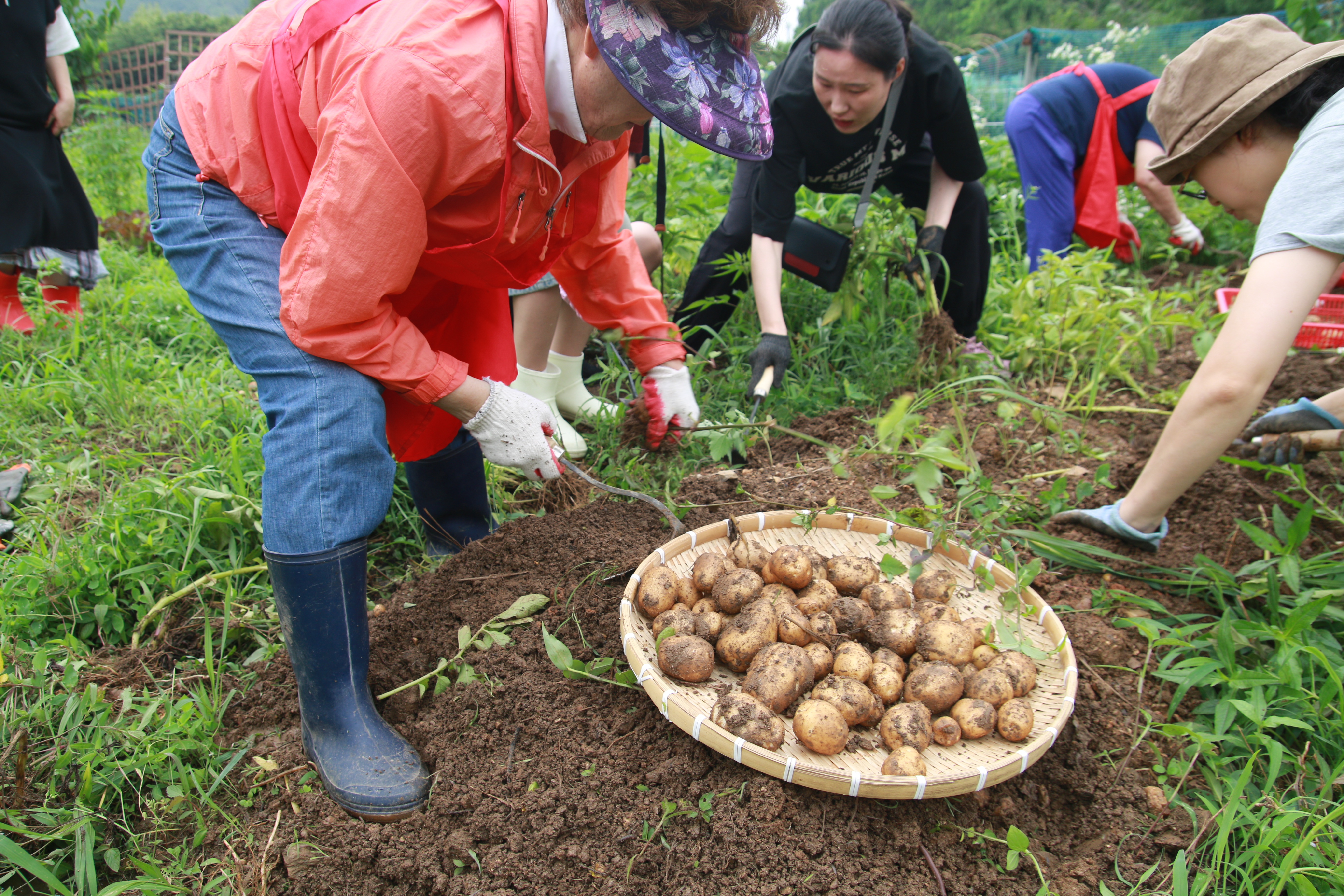 크고 작은 감자들이 담긴 바구니가 여러 개 나왔습니다. 감자캐기 프로그램이 끝나고 캔 감자를 찌고, 전을 부치고, 각각이 준비해온 떡볶이, 김밥, 수박, 전통주 등을 나누며 식사와 교류의 자리를 가졌습니다.
