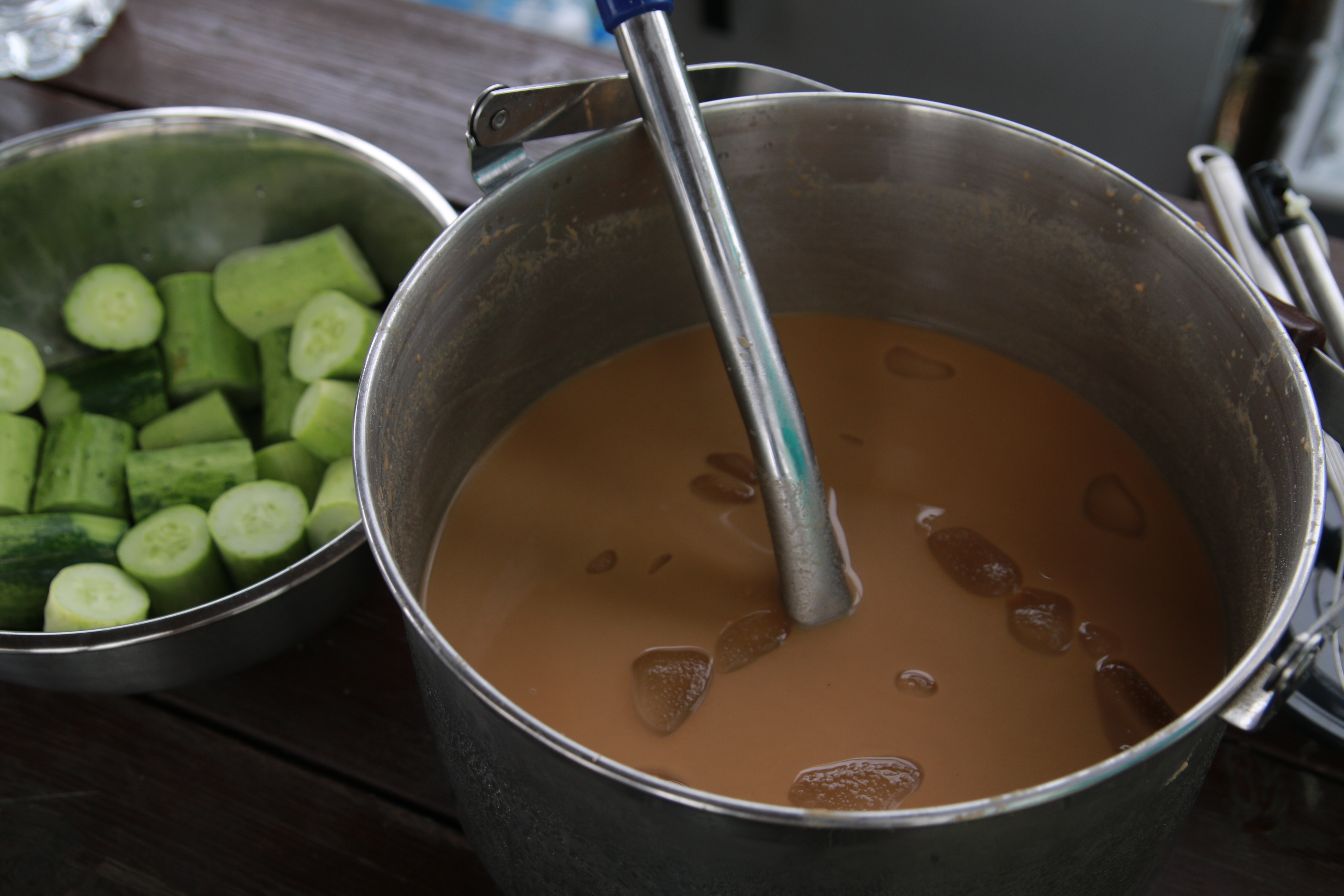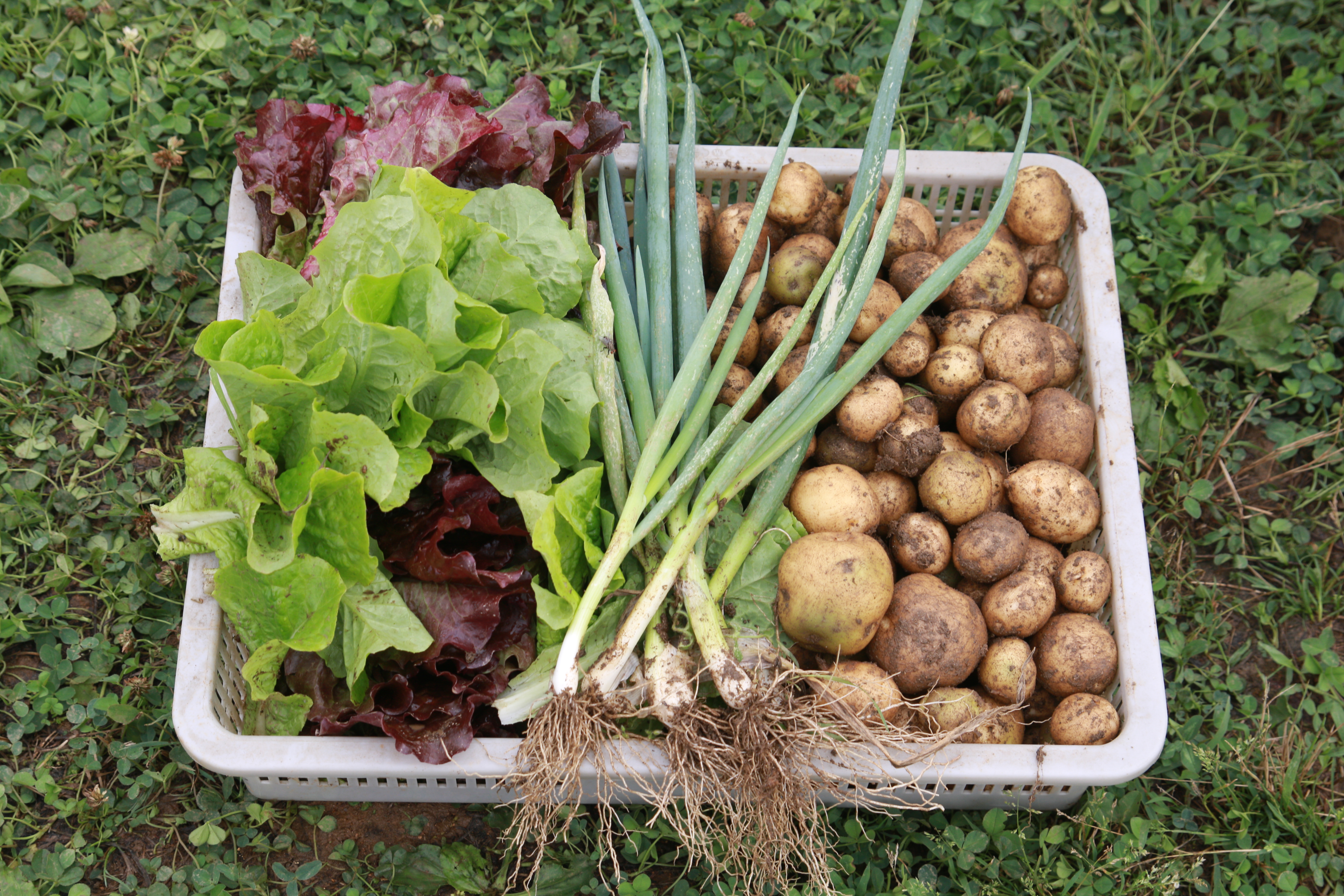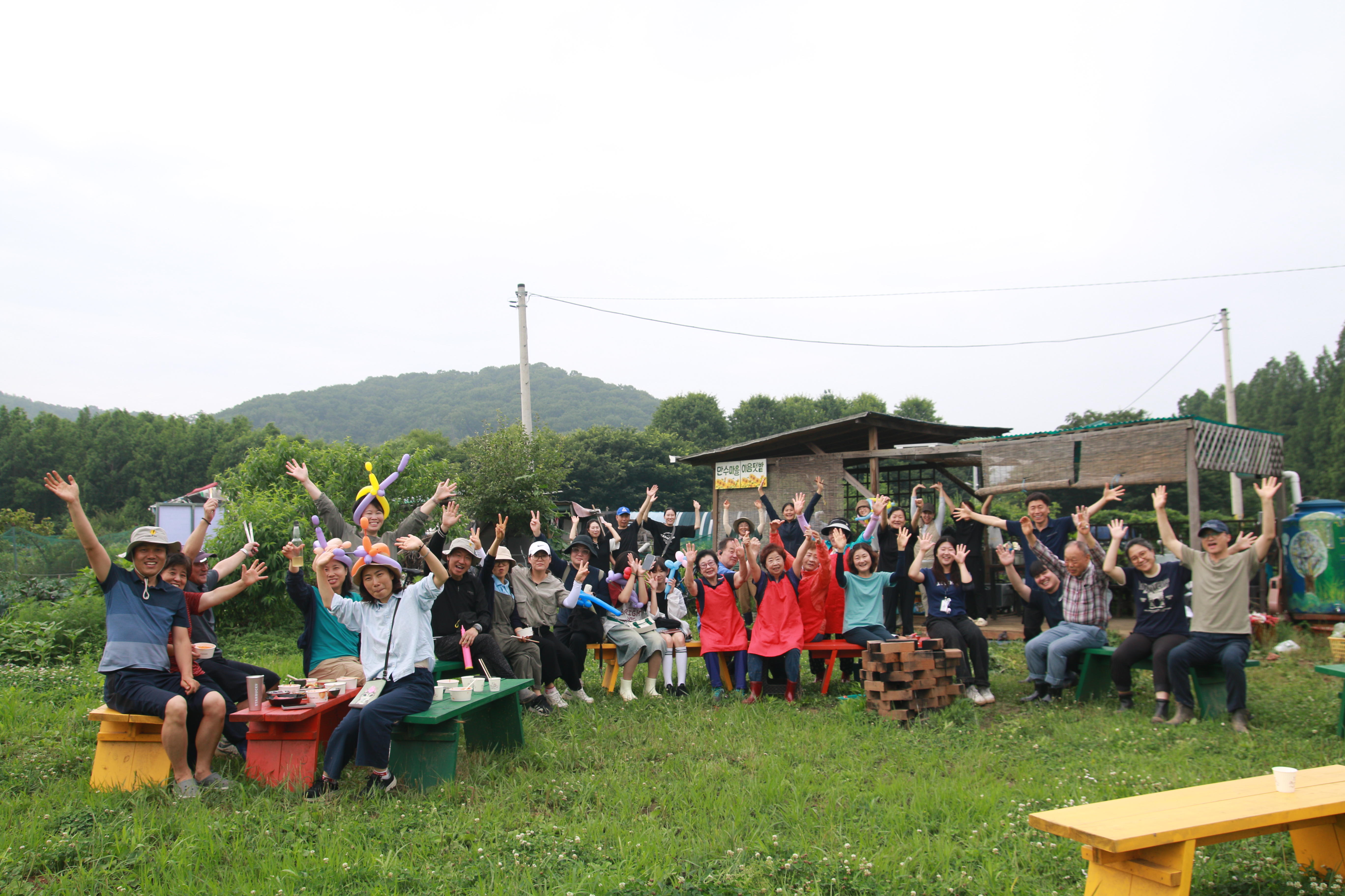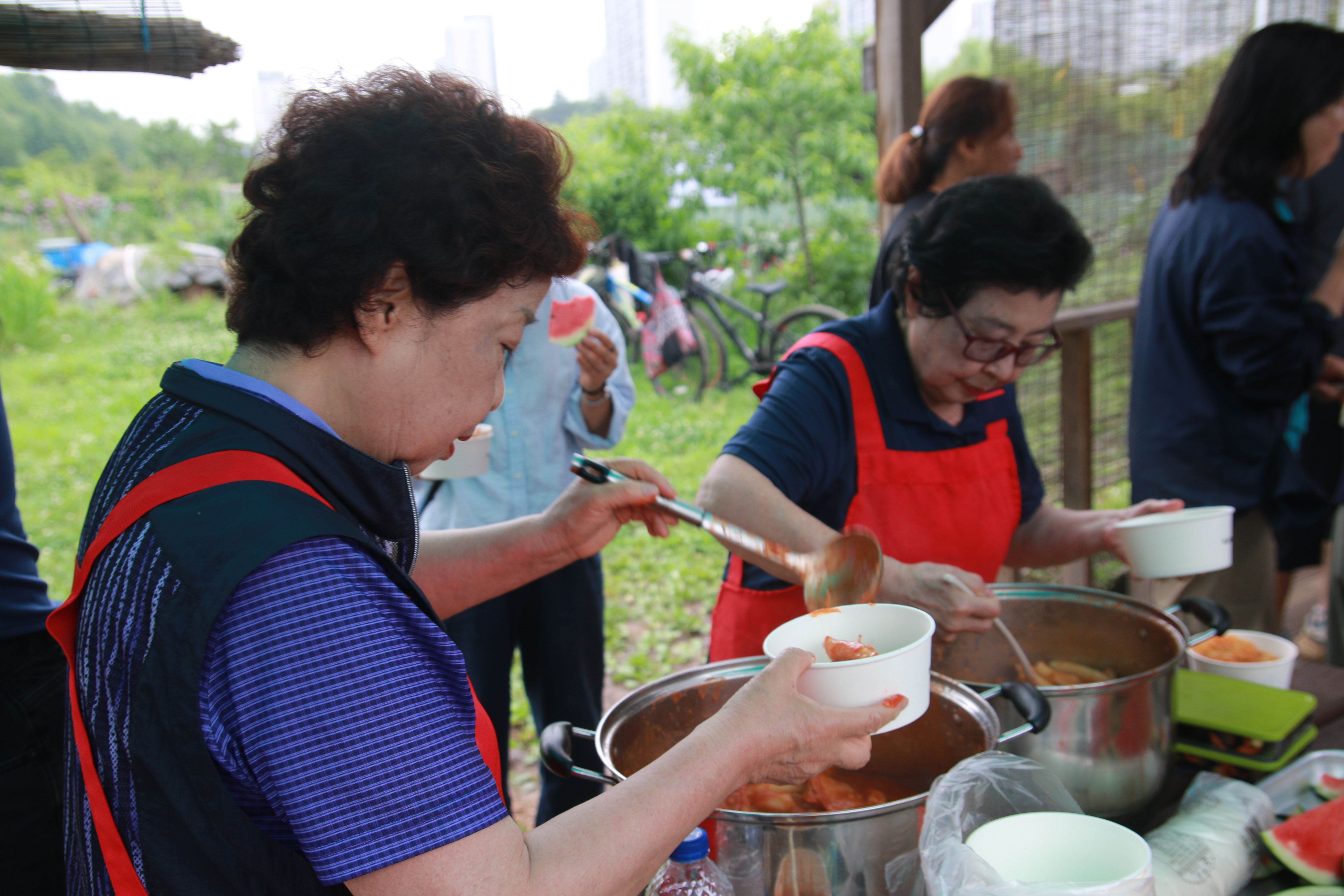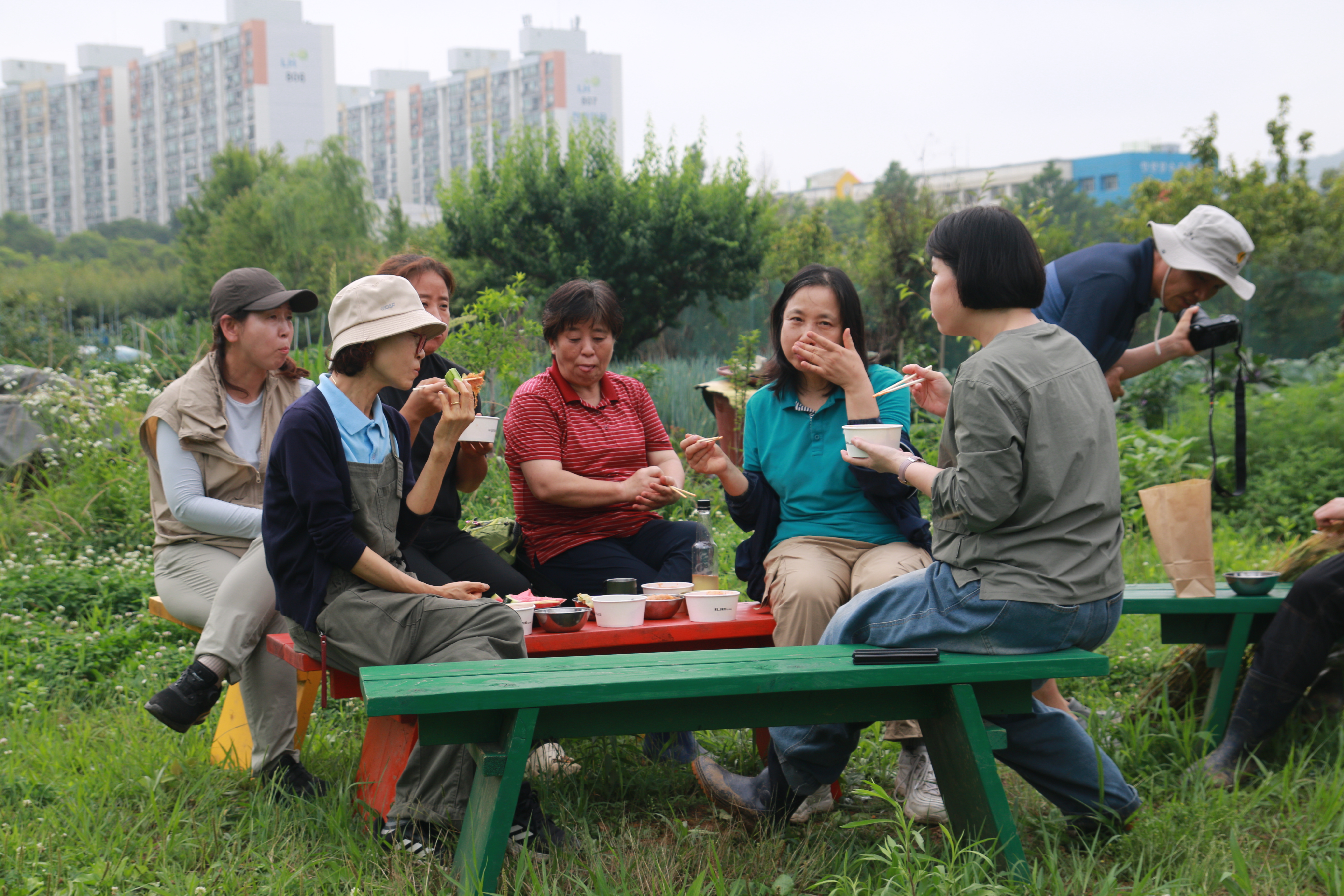 크고 작은 감자들이 담긴 바구니가 여러 개 나왔습니다. 감자캐기 프로그램이 끝나고 캔 감자를 찌고, 전을 부치고, 각각이 준비해온 떡볶이, 김밥, 수박, 전통주 등을 나누며 식사와 교류의 자리를 가졌습니다.