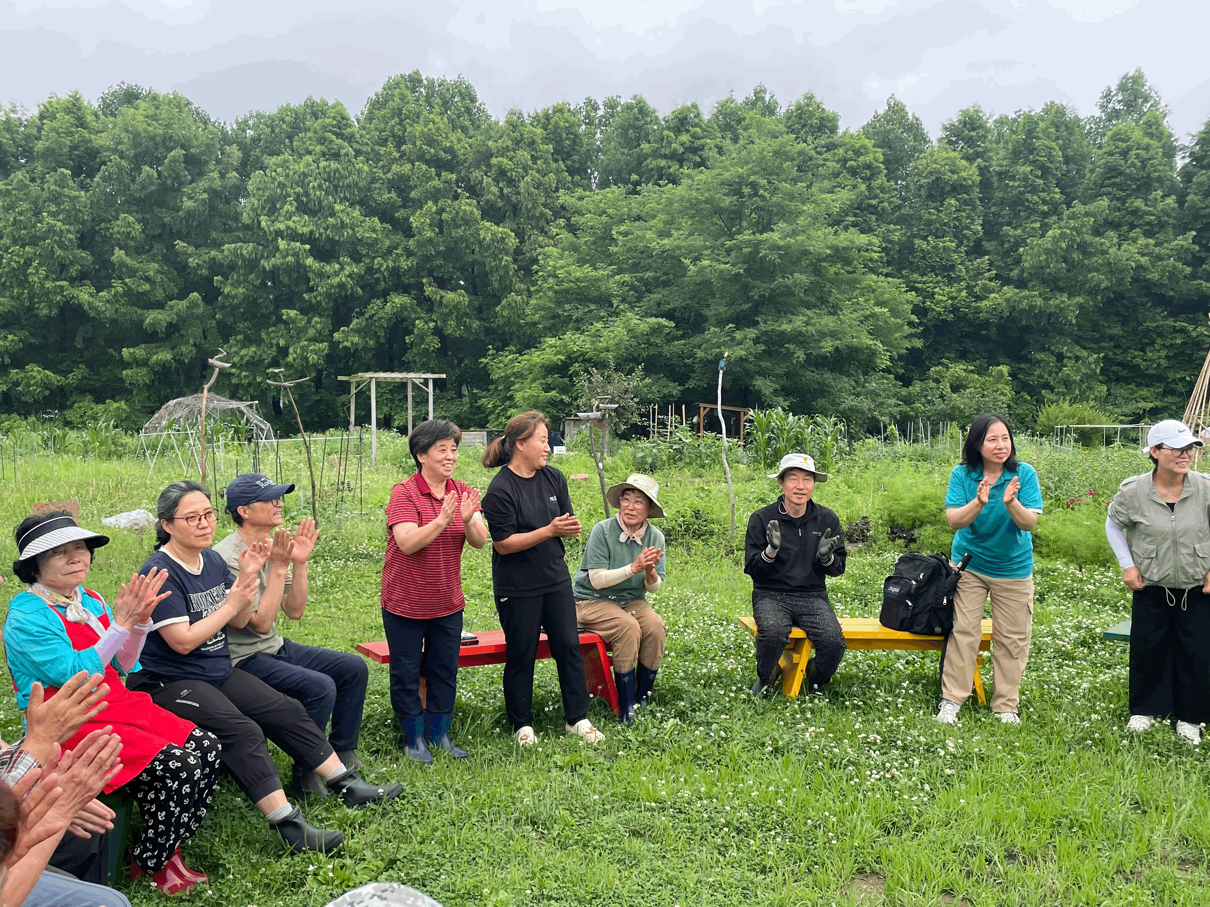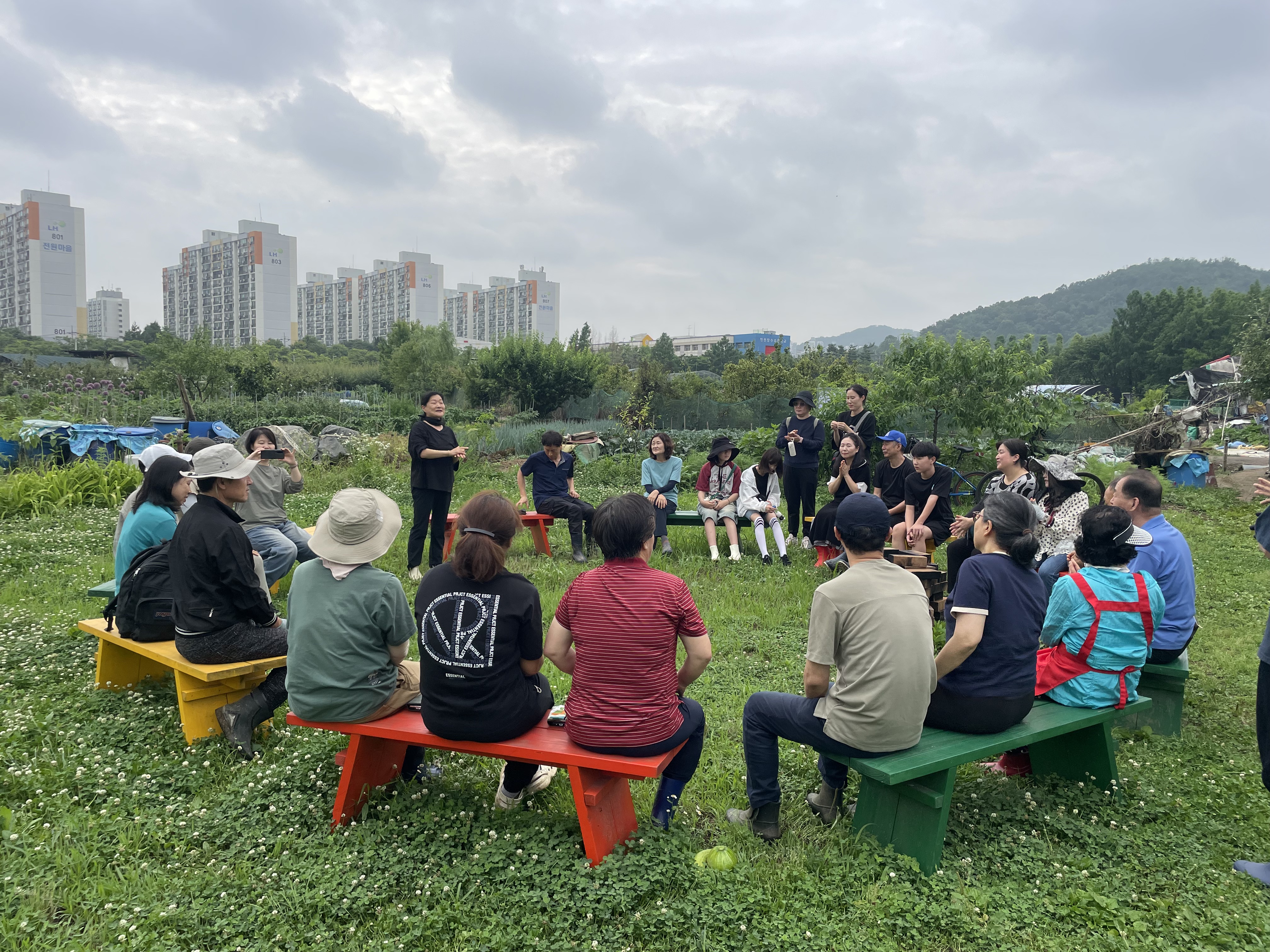 오후 4시 즈음 만수마을이음텃밭의 구성원들이 마당에 하나둘 모이기 시작합니다. 그리고는 동그랗게 놓인 벤치에 둘레둘레 앉아 소개의 시간을 가집니다.
